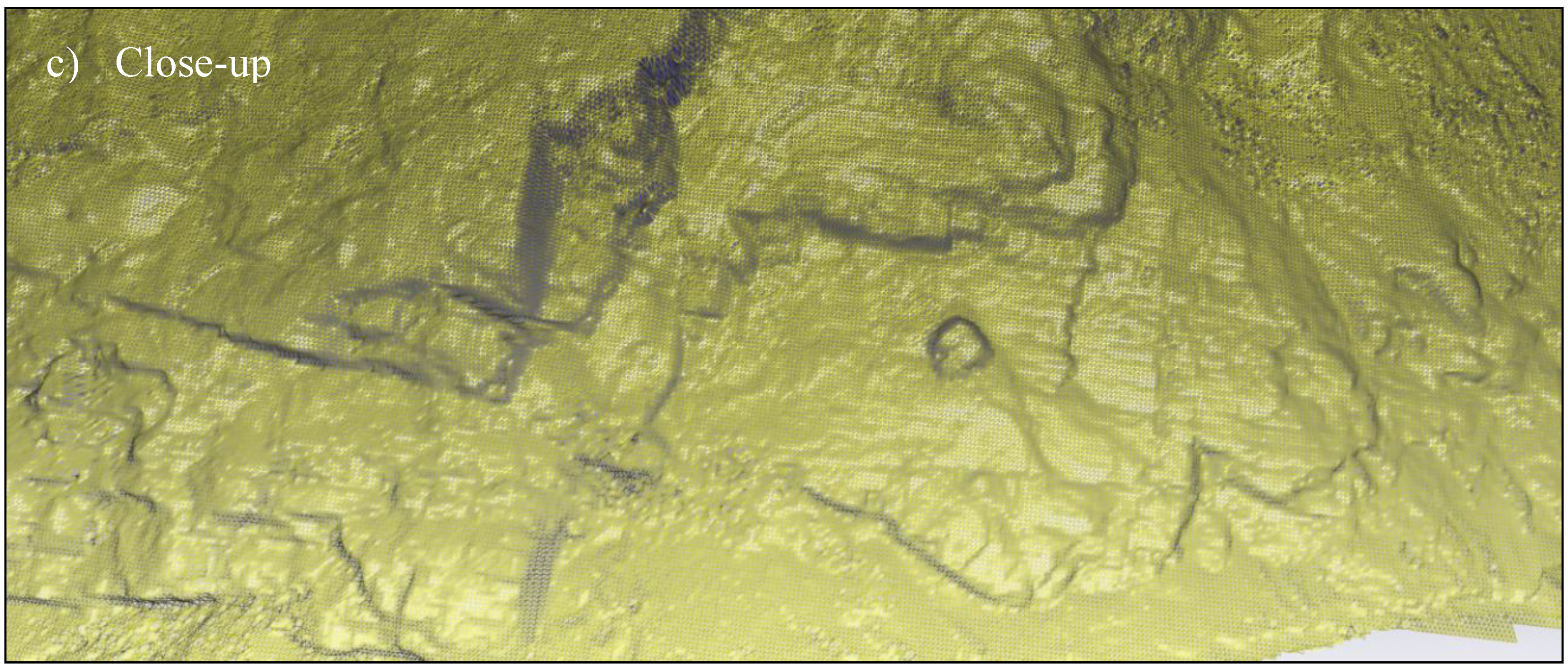 To perform meaningful volumetric change analyses to develop these magnitude-frequency relationships, point clouds are commonly triangulated to produce continuous surface models. However, surface modeling methods can be difficult to employ on surfaces exhibiting high amounts of topographic variability and morphologic complexity. Further, the point sampling on the cliff surface is not uniformly distributed. Many modeling techniques (e.g., [35,36,37,38,39]) have been developed for artificial objects, which are generally smooth and transitions are well defined. Such approaches often do not translate well to creating topographic models where surface changes can vary significantly across small distances [40]. This, in turn, leads to topological artifacts. For accurate volumetric change analysis, surfaces must be free of intersecting triangles, have consistent facet normal orientations, and be free of data gaps (i.e., holes) in the areas to be analyzed. Processing procedures to generate such topologically correct models often require significant manual editing, which can be difficult and cumbersome. Moreover, while a variety of hole filling approaches exist, they are often dependent on the modeler’s interpretation, and thus include an element of subjectivity. The influence of these techniques on the resulting volumetric analyses is often not considered or clearly documented.