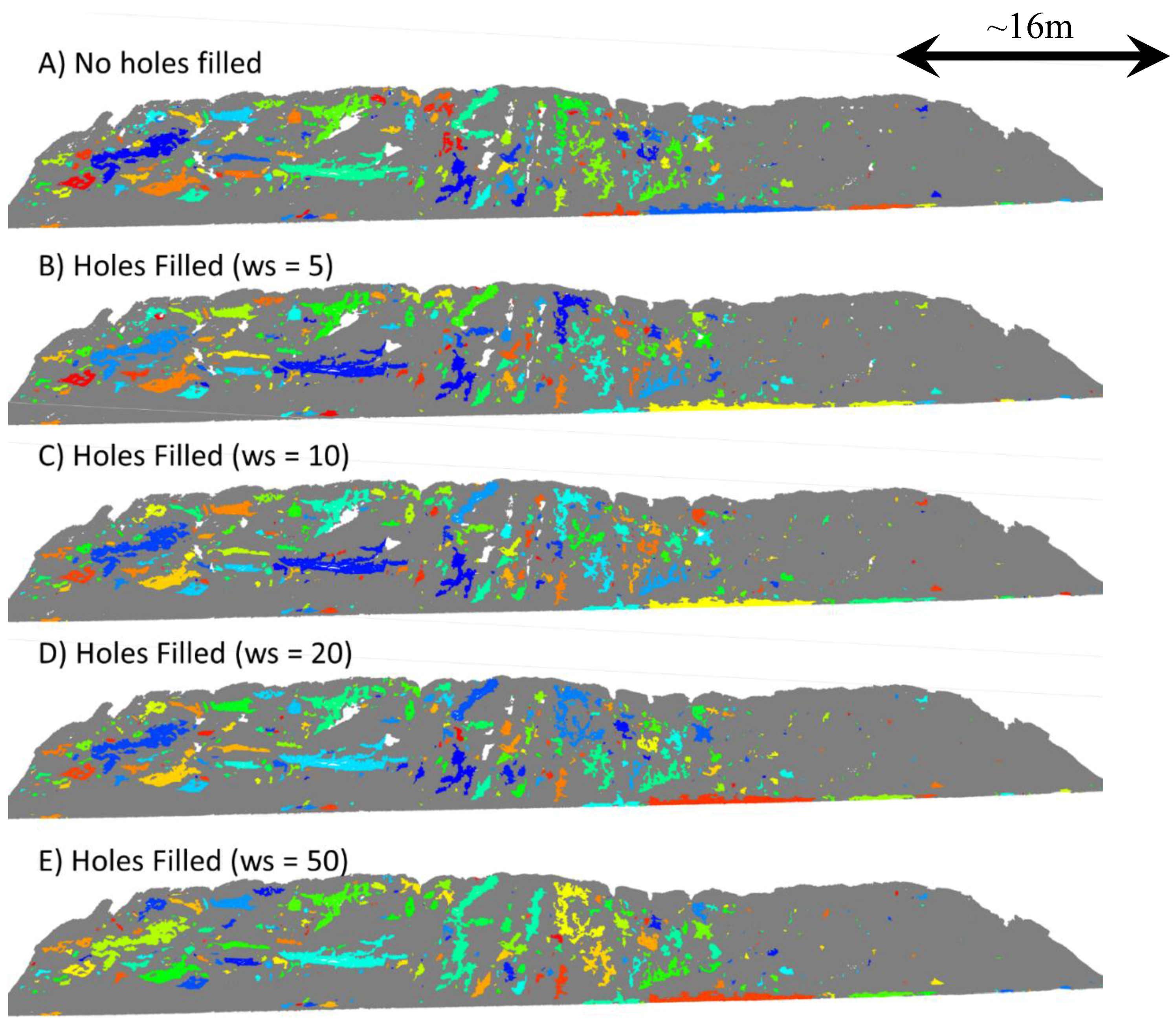 Interestingly, in Figure 14 the rockfall clustering results are similar with different levels of hole filling. Even when large holes were filled (e.g., ws = 50), the 2014 data matched the 2013 data well, as evidenced by the fact that many of those holes did not result in new artificial clusters being identified. This indicates that the TPS is reasonably estimating the surface, even when interpolating across these large holes. Indeed, the hole filling was important to better define the shapes and sizes of the existing clusters, particularly for grouping smaller clusters that were likely part of the same event.