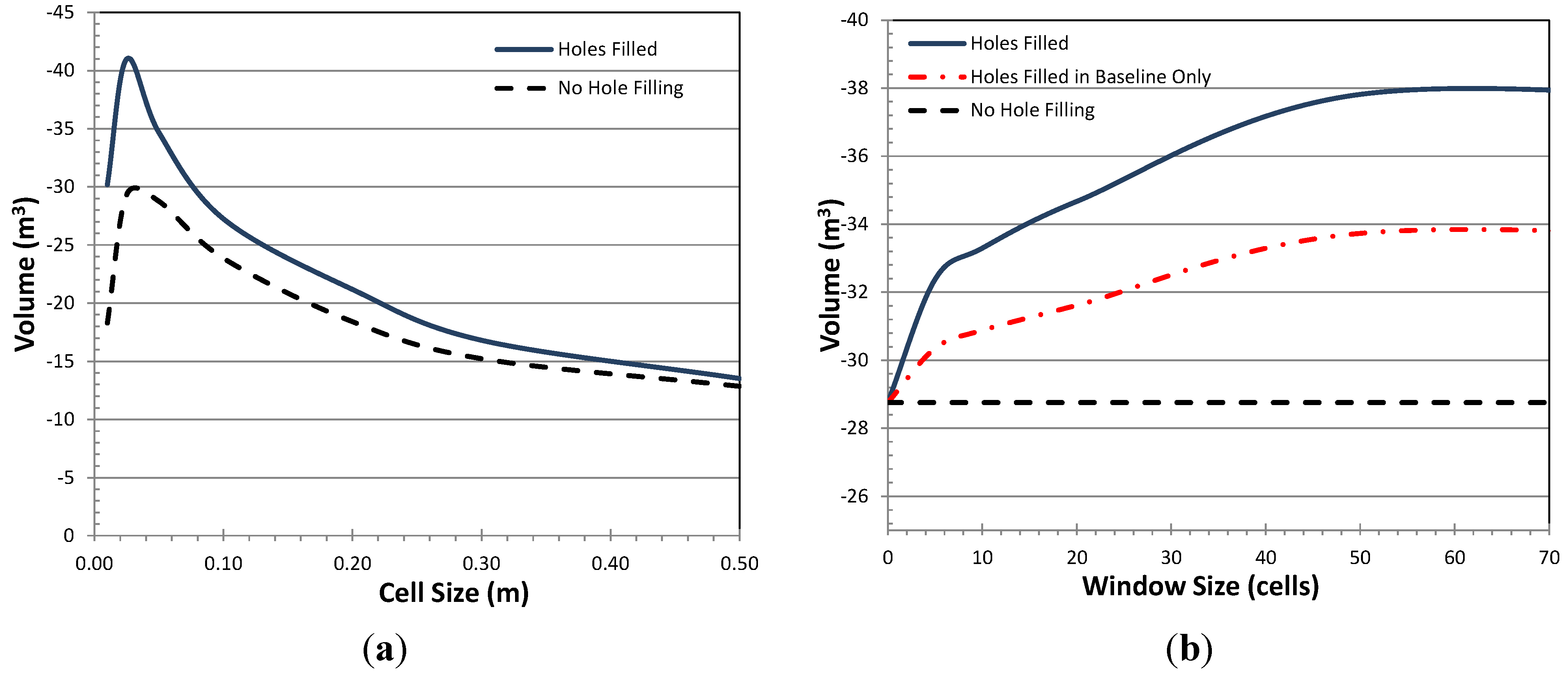 As the cell size increases, there are fewer holes and the volume estimates converge with those for the models where holes are not filled. Decreased resolution smoothes out smaller features on the surface (Figure 9), but also can help reduce noise in the surface that is present at higher resolutions due to the inability to remove short vegetation. This smoothing at lower resolution then effects the ability to detect change and results in smaller events being undetected (Figure 10a and Figure 15a). In turn, this leads to a lower estimated total volume at each site with decreased resolution (Figure 11a, Figure 16a, and Figure 21). Hence, the minimum detectable volume is primarily a function of resolution.