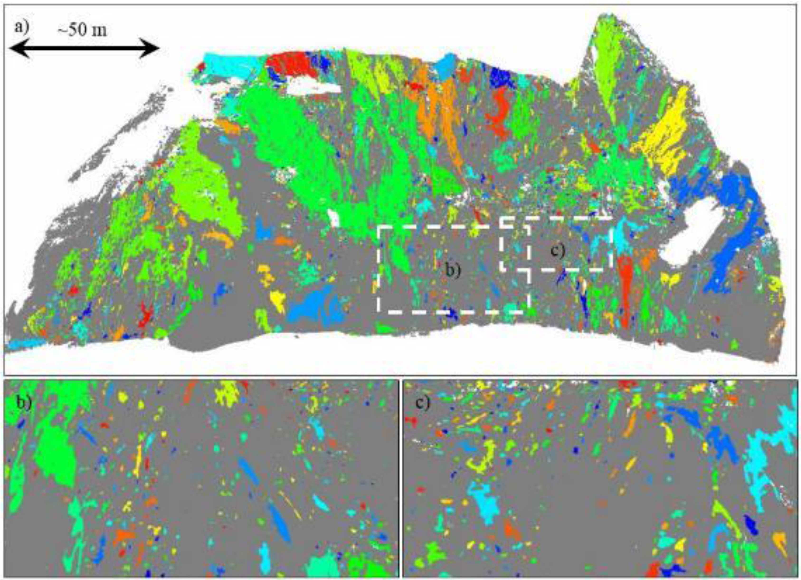 A connected components algorithm [53,54] was then utilized on the significant change grid (δj) in order to isolate individual failure clusters and assign each cell to a cluster. For the erosional events, values of δj = 0 and 1 were considered as background. For accretion events, a second run was completed with values of δj = 0 and −1 considered as background.
