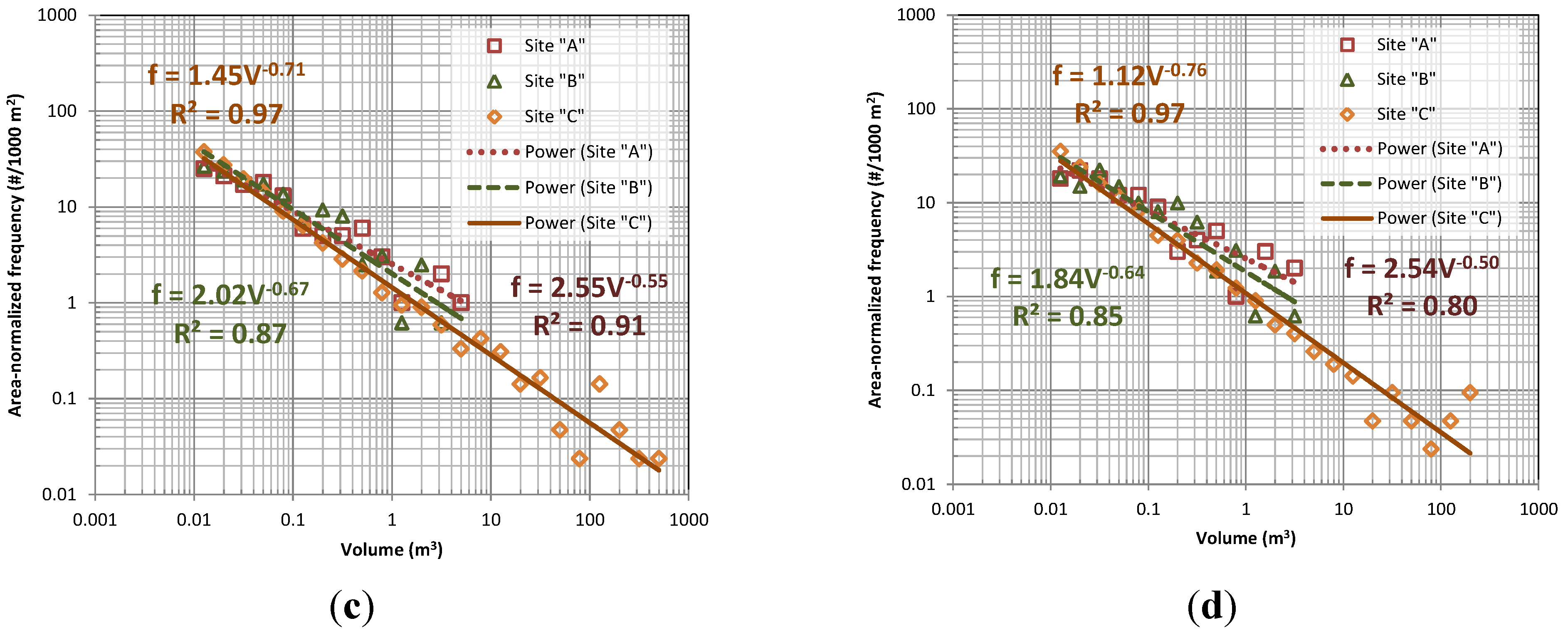 Comparison of magnitude-frequency relationships (2013 to 2014, 0.05 cm holes filled models) and power law regressions for each site, normalized to an equivalent 1000 m2 area based on events >0.001 m3 (a) with and (b) without hole filling and events >0.01 m3 (c) with and (d) without hole filling.