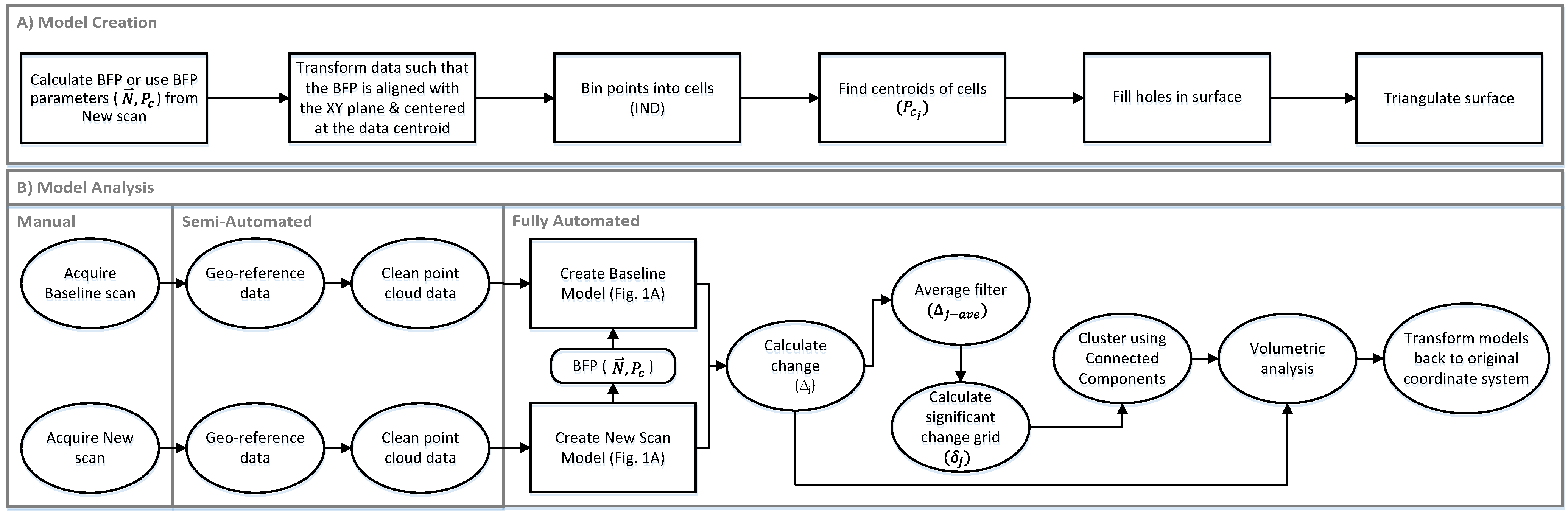 Figure 1B provides the steps for the model analysis. For change analysis, the baseline surface model is created from a point cloud from a previous survey