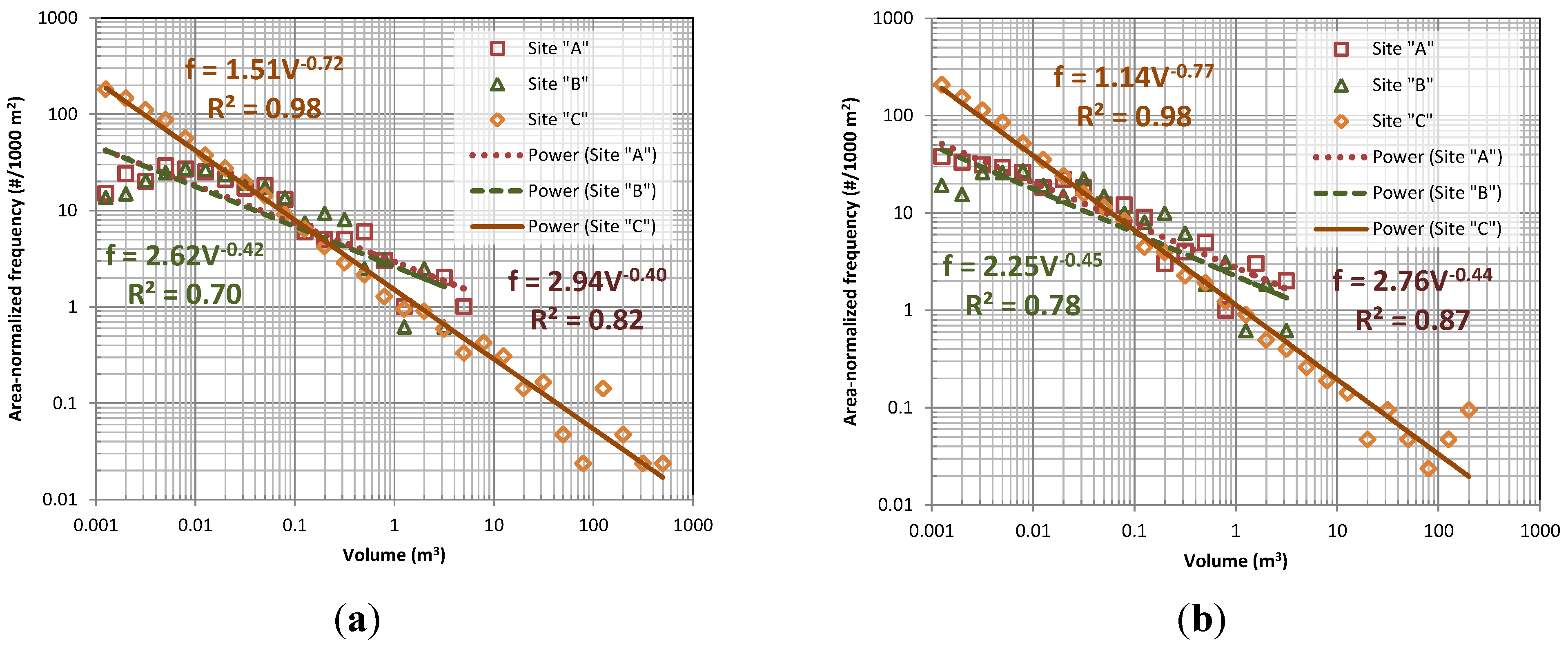 62]. Finally, it is worth noting that although the three sites exhibit generally similar normalized magnitude–frequency characteristics, from a practical perspective, Site C poses a much greater hazard to the highway simply because of its large rock face.