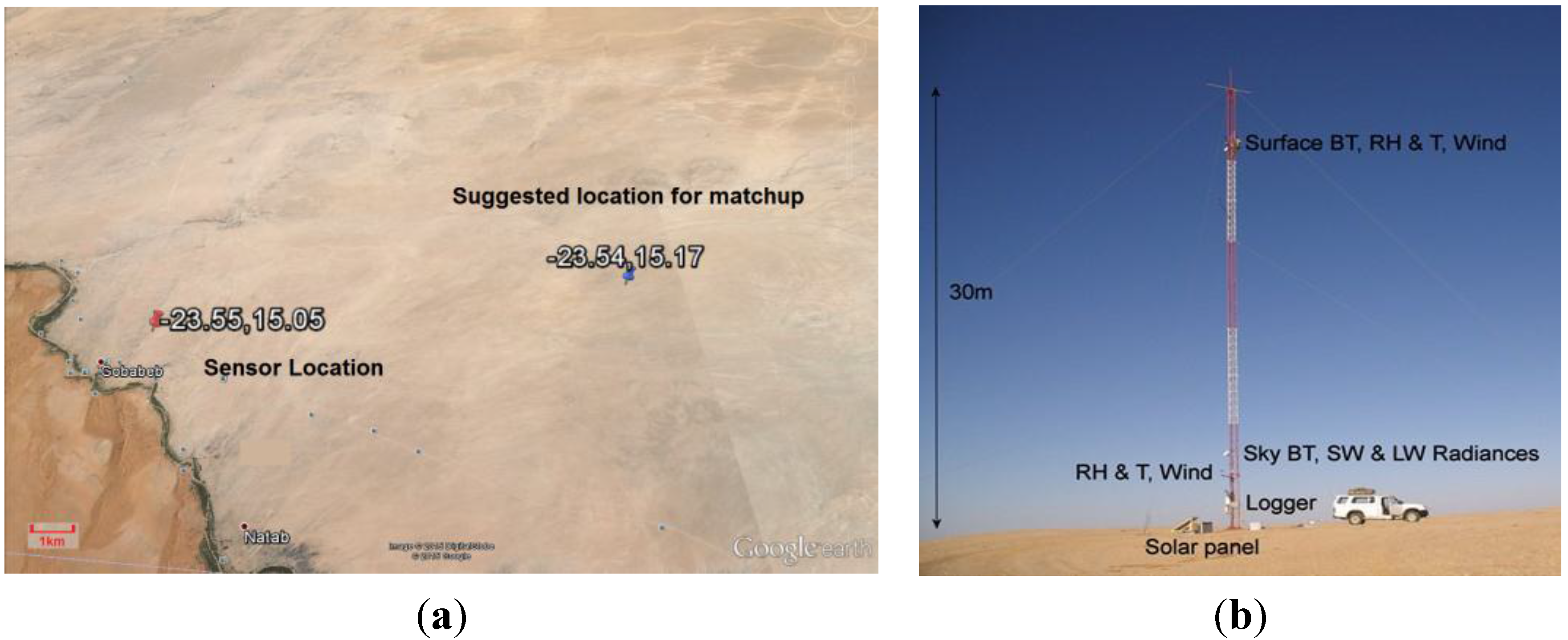 (a) is Geographic landscape in Gobabeb station in Namibia and (b) is the instrumentation for LST measurement: two radiometers measure the surface-leaving radiance (9.6–11.5 μm) from the gravel plain, which is highly homogenous over at least 2500 km2. A third radiometer measures sky radiance.