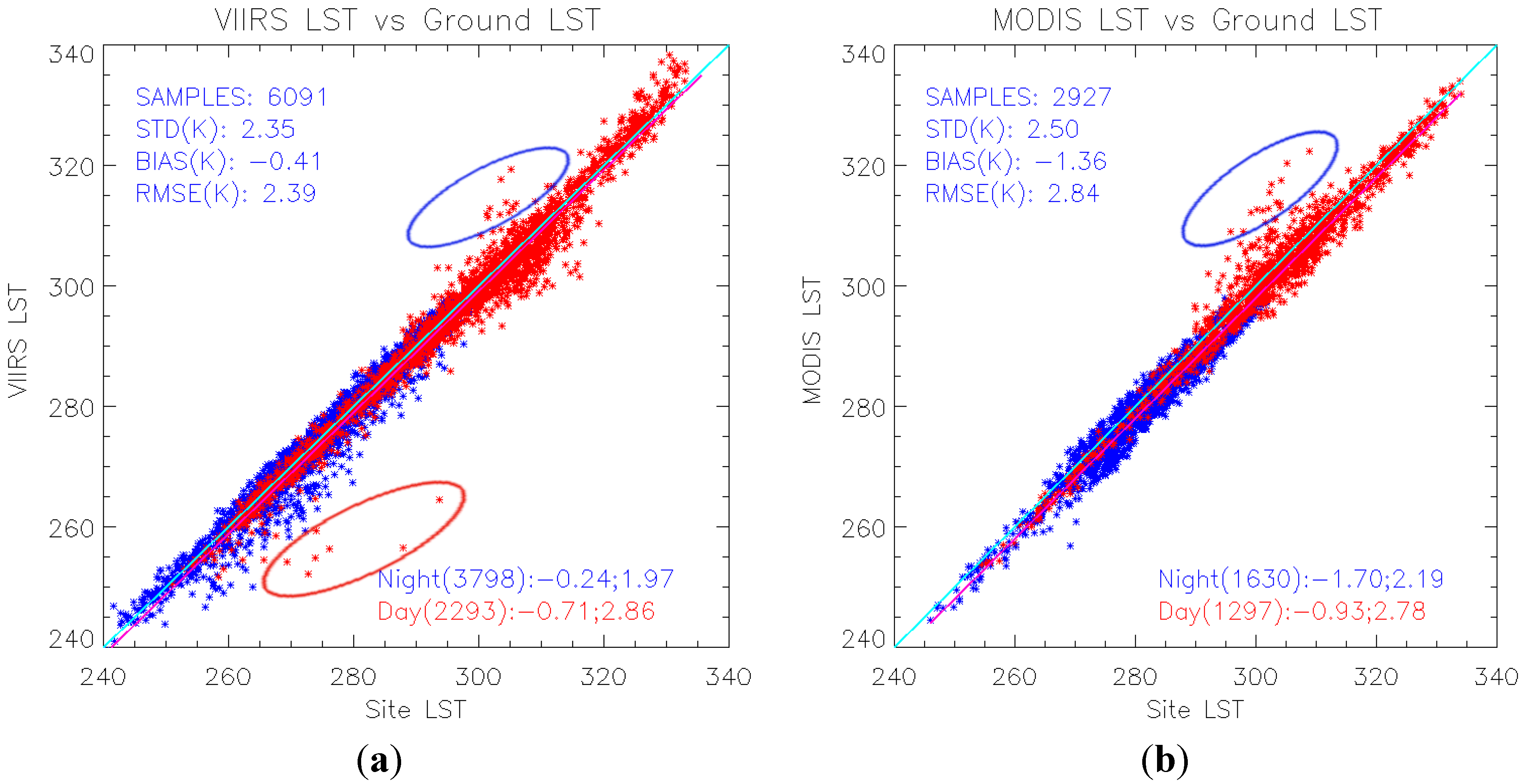 Scatter plots of the VIIRS LSTs (a) and MODIS LSTs (b) against the SURFRAD LSTs compared in the period from February 2012 to April 2015. Overall accuracy and precision of the satellite LSTs referring the SURFRAD LSTs are noted, as well as the daytime and nighttime cases. Some VIIRS LST plots are circled as suspicious cloud contaminated plots (red).