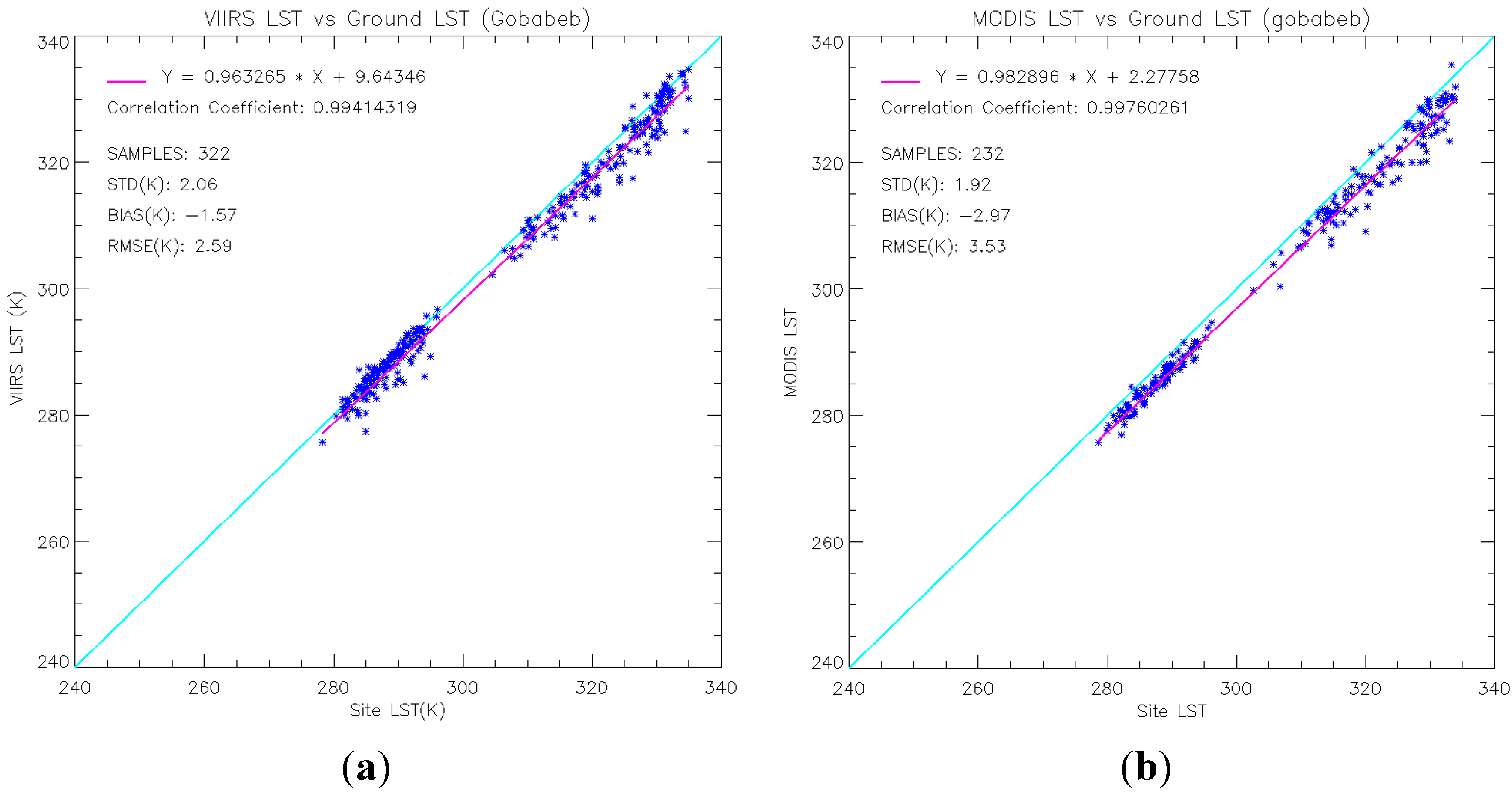 A similar comparison of the VIIRS LSTs and the AATSR LSTs against the SURFRAD LSTs is shown in Figure 3. In which, bias and of the VIIRS LSTs are −0.78 K and 2.34 K, respectively, which is comparable to that of the AATSR LSTs (i.e., −0.20 K and 2.42 K, respectively). Note that VIIRS LST is on average 0.5 K colder than AATSR LST.