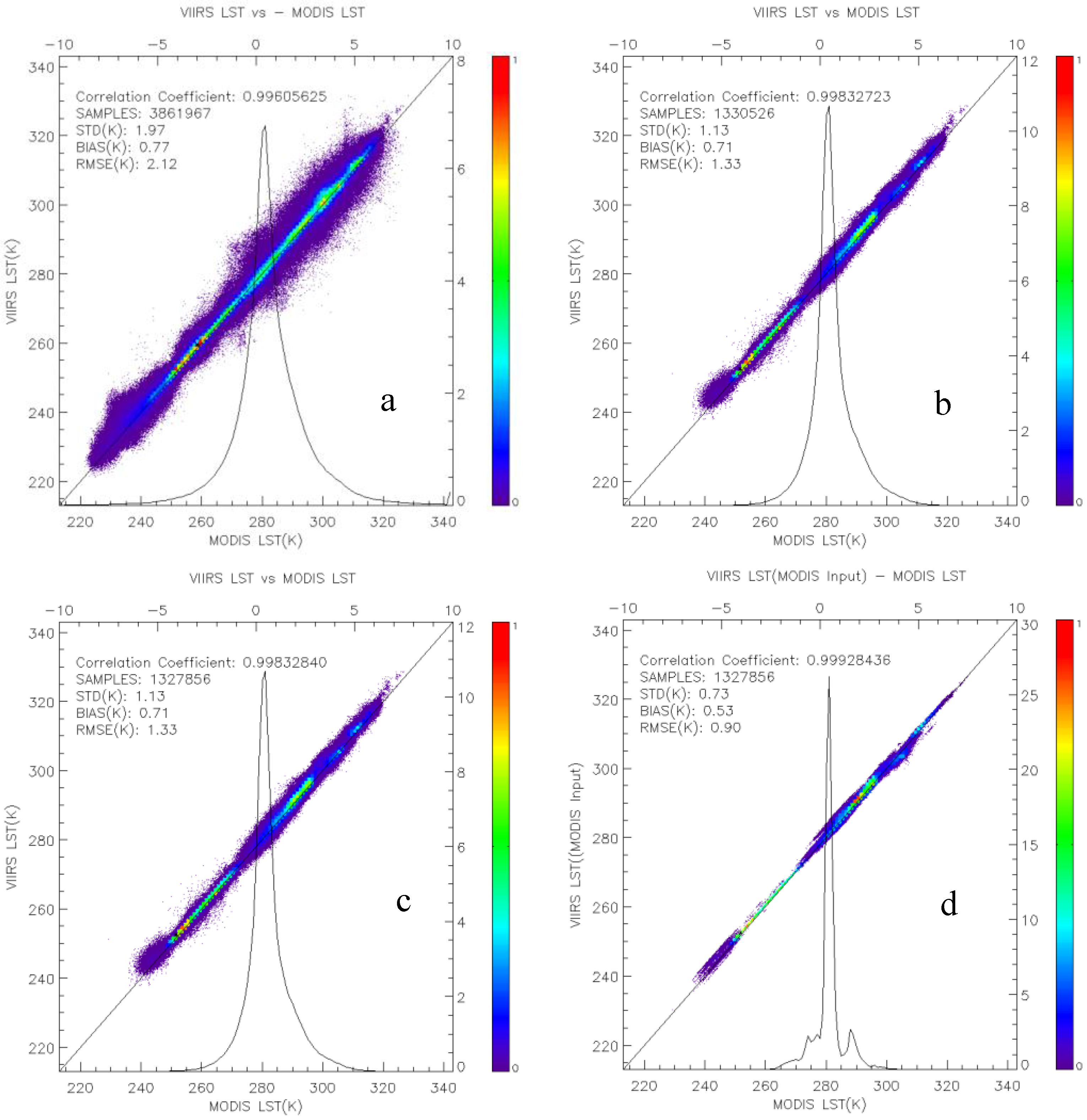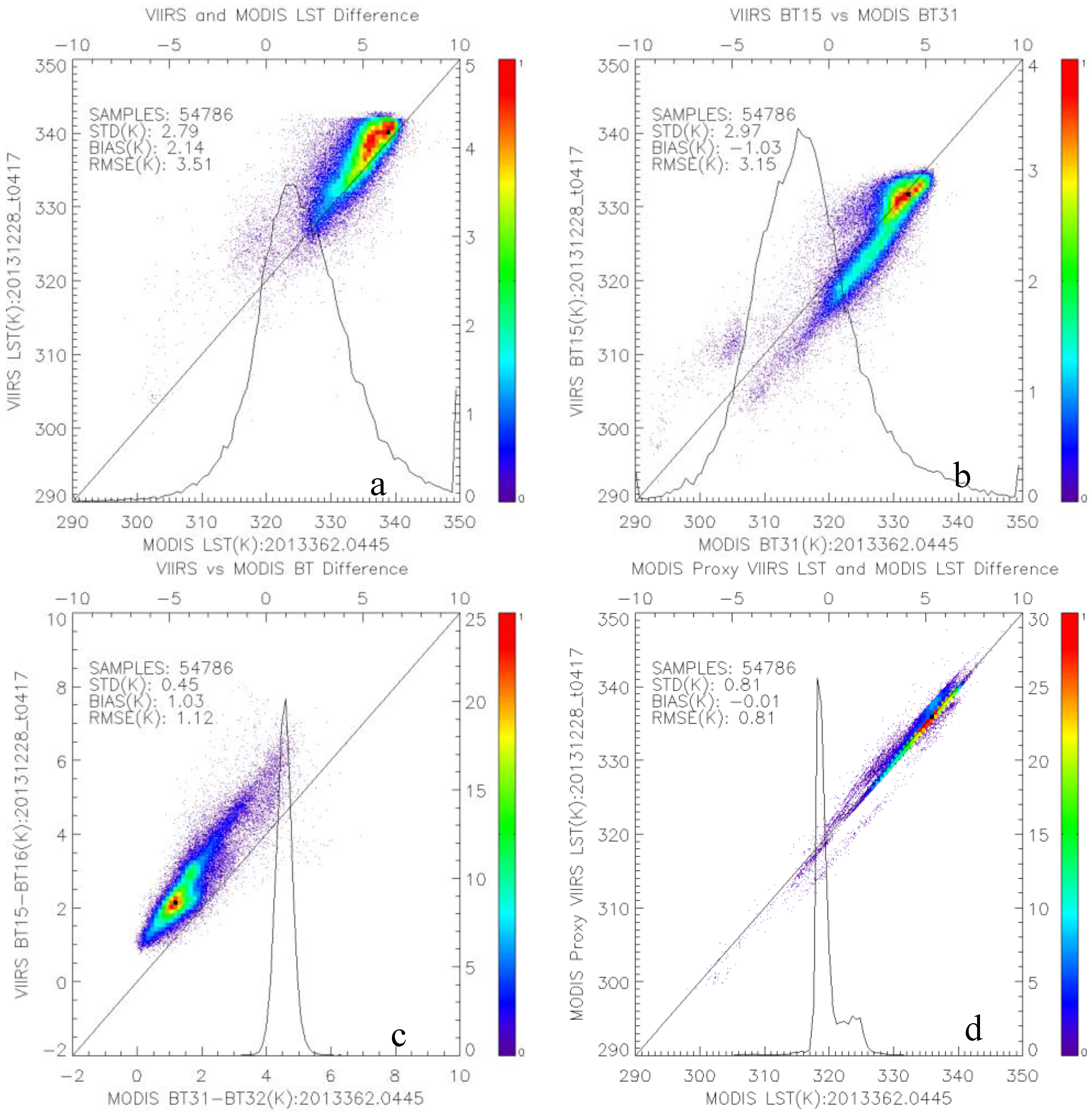 It is found that the VIIRS BT15 is on average 1 K colder than MODIS BT31 (Figure 6b) but the VIIRS BT difference between two split windows is statistically 1 K higher than that in MODIS (Figure 6c), which is considered as the main cause for the large LST discrepancy as the impact of BT difference on VIIRS LST is not linear but quadratic growth. For verification, we calculate VIIRS LST using the same proxy method in generating Figure 5d and then compare with MODIS LST. The LST discrepancy becomes much smaller as shown in (Figure 6d) with a bias of 0.01 K. Therefore, it once again suggests that the algorithm difference is not the main cause for the large discrepancies. However, VIIRS LST might overcorrect the atmospheric absorption under very high BT difference condition, which results in the LST degradation for the particular case.