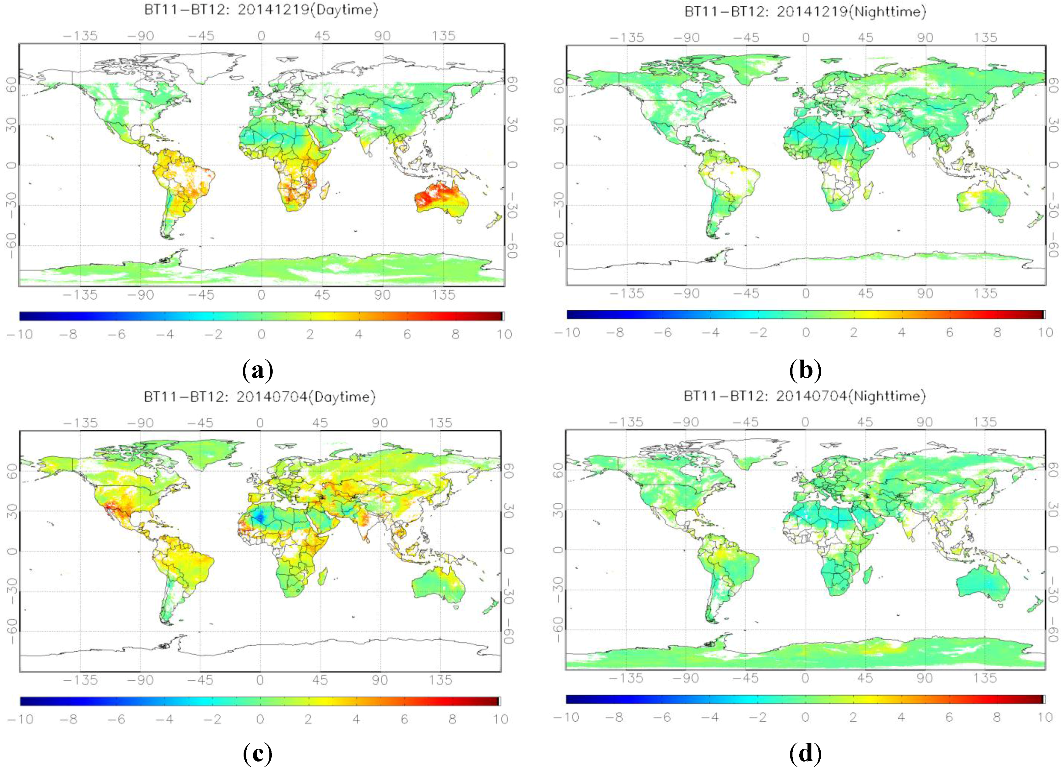 Global BT difference distribution map for 19 December 2014 at daytime (a) and nighttime (b); 4 July 2014 at daytime (c) and nighttime (d).