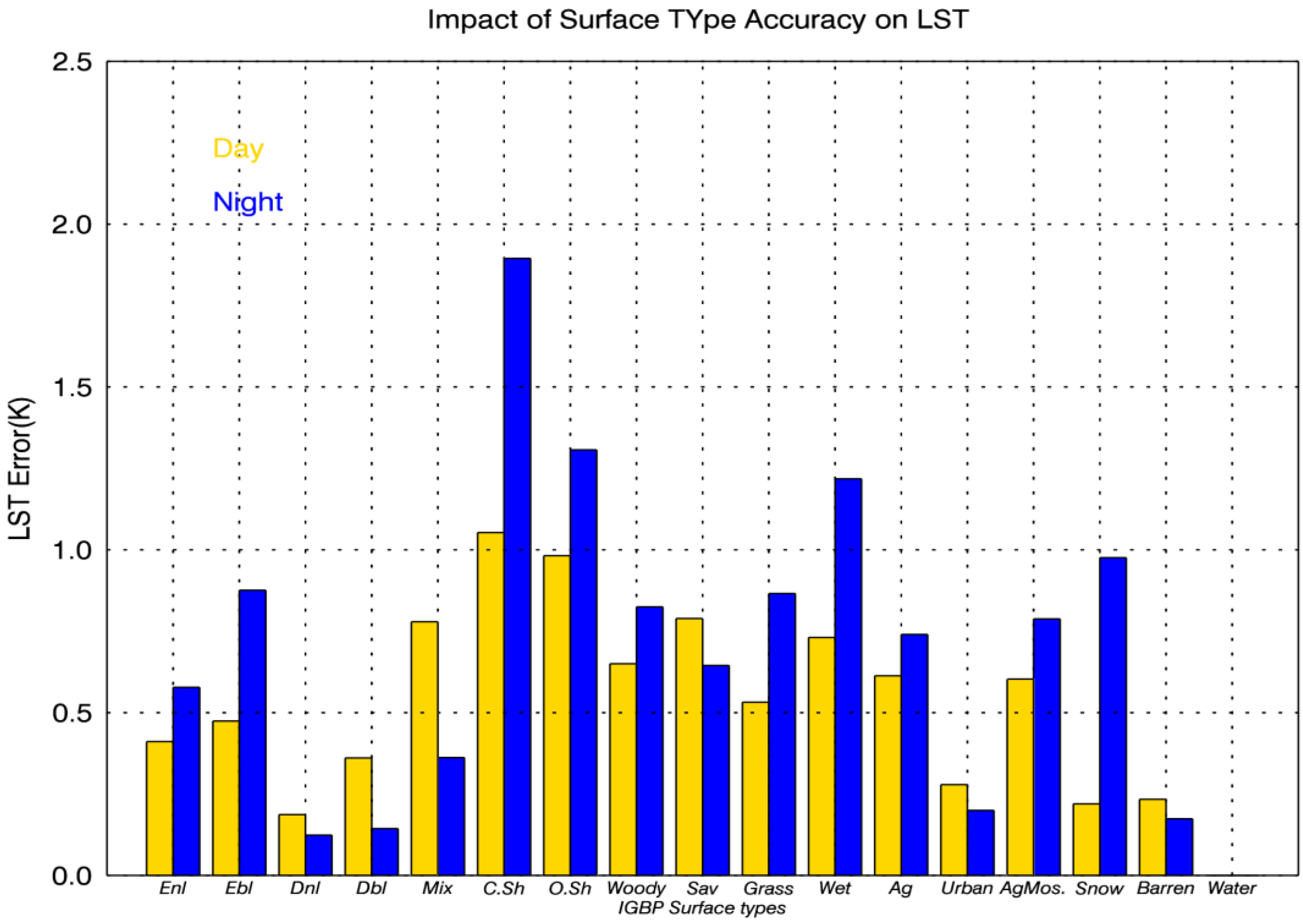 Note also that the VIIRS LST algorithm is surface type dependent and therefore the impact of error in surface type input is a concern. Theoretical analysis of the algorithm uncertainty due to the surface type has been described in Section 3.3. Figure 8 shows that the overall LST uncertainty caused by surface type misclassification is 0.73 K, more specifically, 0.83 K for nighttime and 0.61 K for daytime. The impact varies significantly with different surface types and day/night conditions. The most significant impact is found over closed shrubland in which an LST uncertainty of 1 K is found at daytime and 1.9 K at nighttime. Though the accuracy over snow/ice surface type is as high as 91%, the 9% misclassification causes 1 K LST uncertainty. Therefore, the impact of surface type accuracy on LST uncertainty is closely related to the emission characteristics differences between the correct surface type and misclassified surface types. It is noted that the daytime uncertainty is smaller than nighttime uncertainty from the theoretical analysis. The combination of atmospheric conditions and SW coefficients turn night-time LST estimates more sensitive to errors in surface type classification than daytime retrievals.