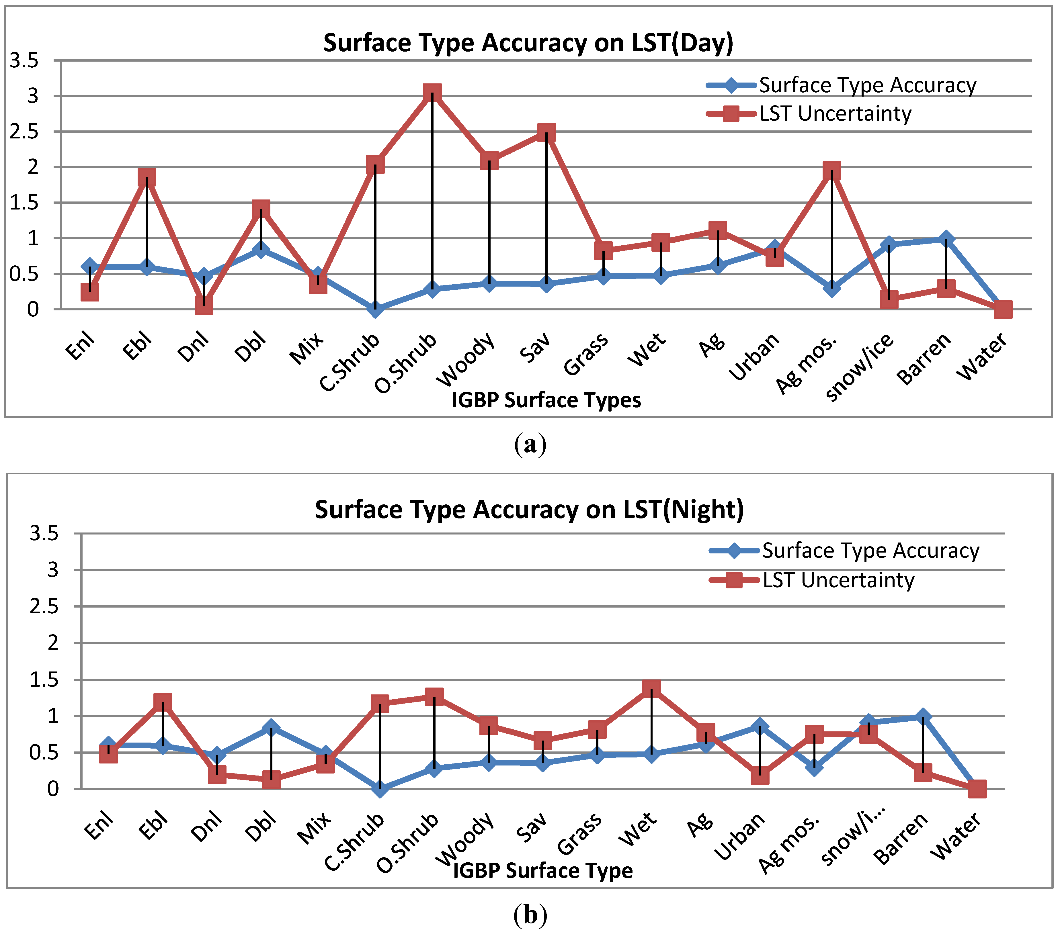 LST uncertainty associated with the uncertainty in surface type classification. These values are estimated using the simulation dataset for all surface types and day/night conditions.