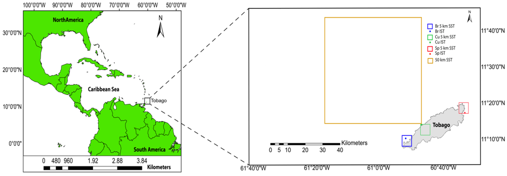 SST time series for both 50 km and 5 km products were extracted from the water pixels containing (5 km) or nearest to (50 km) each of the IST stations in Tobago (Figure 1). Table 1 provides the locations of each pixel for which SST data were extracted for both satellite datasets. Note that the same 50 km pixel was identified for all three reefs, due to the conservative land mask applied in the 50 km SST [23]. Further, we observed that the pixel containing the Culloden deployment was predominantly over land. While the 5 km SST algorithm ensures only information from water retrievals contributes to the final value [23], the small coverage of water by this pixel suggests that values here may heavily incorporate data from surrounding locations through the gap-filling algorithm.
