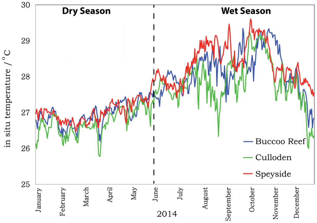 3.1. In Situ Water Temperature during 2014 for Buccoo Reef, Culloden and Speyside, Tobago