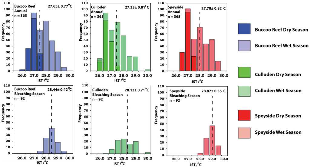Histograms of in situ temperature (IST) recorded at three reefs off Tobago for annual (2014) and during the bleaching season (August to October, a subset of the wet season). Dashed line shows the temporal mean, also shown numerically with one standard deviation.