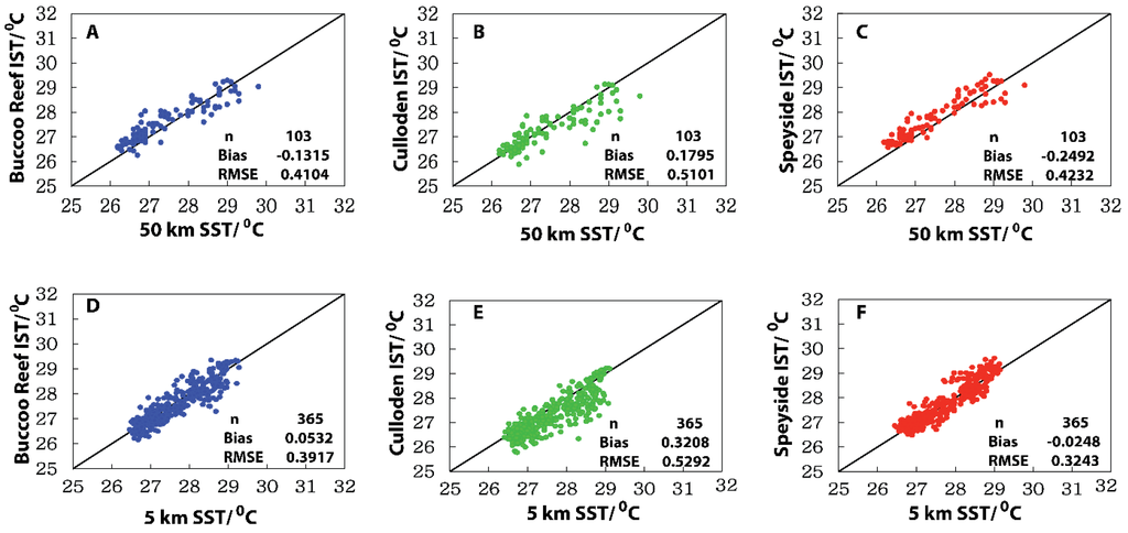 Comparison of 50 km SST (A–C) and 5 km SST (D–F) with in situ temperature (IST) measurements for 2014 at Buccoo Reef (A,D), Culloden (B,E) and Speyside (C,F), Tobago. The black line is the line of unity. Positive bias indicates SST greater than IST.