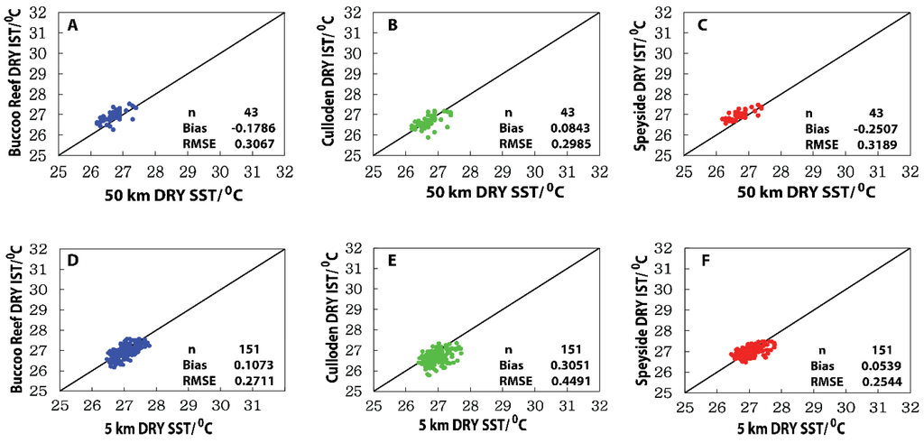 Analyzing dry and wet seasons separately can reveal any seasonal changes in performance of the satellite SST. During the dry season, 50 km SST at Buccoo Reef and Speyside was cooler than IST, as indicated by the negative bias (Figure 5A,C). In contrast, dry season 50 km SST at Culloden was warmer than the IST and with a smaller magnitude bias (Figure 5B). However, the consistency of the temperature difference (given by the RMSE) was very similar for all three sites.