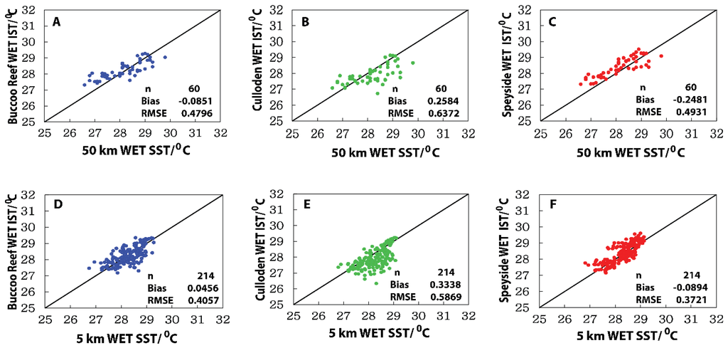 Comparison of 50 km SST (A–C) and 5 km SST (D–F) with in situ temperature (IST) measurements for the 2014 wet season at Buccoo Reef (A,D), Culloden (B,E) and Speyside (C,F), Tobago. The black line is the line of unity. Positive bias indicates SST greater than IST.