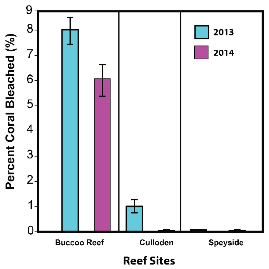Percentage coral bleaching observed from the Reef Condition Monitoring Program (RECON) surveys conducted in September 2013 and September 2014 at Buccoo Reef, Culloden and Speyside.