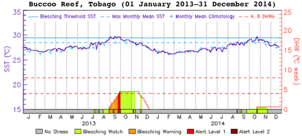Twice-weekly 50 km sea surface temperature and Degree Heating Weeks (DHW) for 2013 and 2014. These products represent all three reefs sites: Buccoo Reef, Culloden and Speyside.