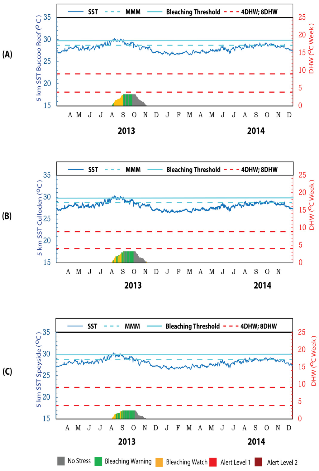 In contrast, the 5 km DHW values that represent thermal stress at the three reef sites are from distinct pixels and therefore independent of each other (Figure 9). In 2013 the three maximum thermal stress values experienced at Buccoo Reef, Culloden and Speyside were 2.35 °C-weeks, 2.24 °C-weeks and 1.11 °C-weeks, respectively. In 2014, no DHWs were accumulated at Buccoo Reef, Culloden and Speyside (though temperature rose above the MMM producing maximum HotSpot values of 0.47 °C, 0.27 °C and 0.31 °C, respectively; (Figure 9A–C). Buccoo Reef experienced the highest thermal stress in both years.