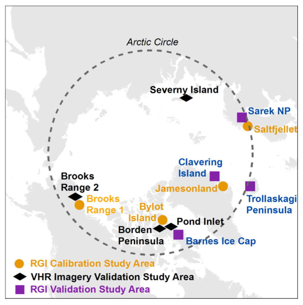 We developed and tested the automated PISC mapping approach using data from four regions distributed throughout the Arctic, which we refer to as RGI calibration study areas (