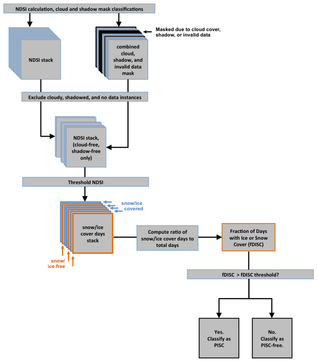 For each pixel in the study domain, our approach identifies the available cloud-free, shadow-free (and otherwise valid) land surface views and then compiles a stack of NDSI values corresponding to each valid land surface view. A threshold value is then applied to the stack of NDSI values to identify each land surface view in the stack as snow or ice-covered or snow or ice-free. The ratio of days with snow/ice to the total days, which we refer to as the fraction of Days with Ice or Snow Cover (fDISC) is then computed and a second threshold value is used to identify the pixel as PISC or PISC-free. A diagram of this processing flow is presented in
