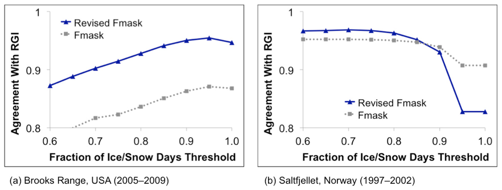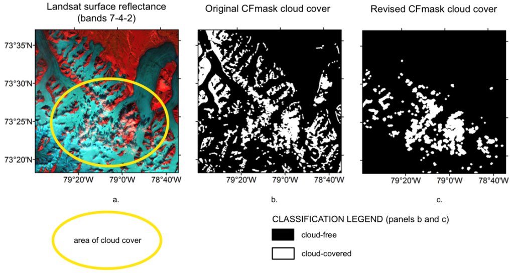Figure 3). More importantly, the errors of commission were not randomly distributed across areas with rock and ice cover, but were consistently present at the same patches of land cover on multiple occasions, thus resulting in a potential bias in available cloud-free data. We considered the high rate of errors of commission and particularly the potential for bias to be unacceptable for our purposes. We implemented a revised cloud masking approach designed to reduce errors of commission from the CFmask cloud masks over mountainous environments dominated by rock, snow, and ice, allowing us to fully exploit nearly all available cloud-free land surface views acquired during the late summer period. The revised cloud masking approach employed classification trees that reevaluated all instances of pixels where the CFmask product indicated cloud cover. The classification trees were originally developed for a seasonal snow covered area monitoring project and are based on over 100,000 pixels acquired from 20 Landsat scenes from mountainous areas across the globe. The classification tree approach relies on data from Landsat bands 1–5 and 7 to make a final distinction between cloud-covered and cloud-free pixels in cases where the original CFmask indicated cloud cover. Testing of the classification tree approach in conjunction with the original CFmask data indicated a slight improvement in overall accuracy (from 89% to 91%), with a major improvement in accuracy for high mountain areas from around the globe with substantial snow and ice cover (from 66% to 88%).