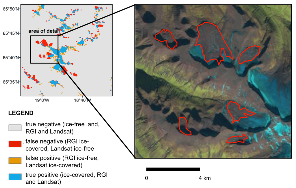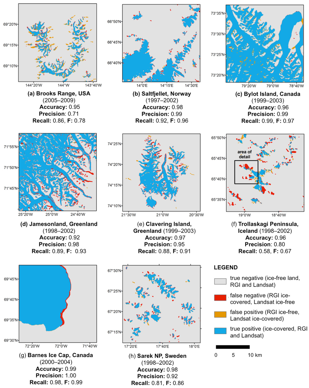 We assessed the accuracy of the resulting PISC maps at each study area by comparing PISC maps from our approach to the glacier outlines from the RGI. While the accuracy at the four RGI calibration study areas could potentially be biased because those study areas were used to identify optimal threshold values for NDSI and fDISC used in the algorithm, the four RGI validation study areas and the VHRI validation study areas were included to allow for an unbiased assessment at study areas that had not been used in the algorithm development.
