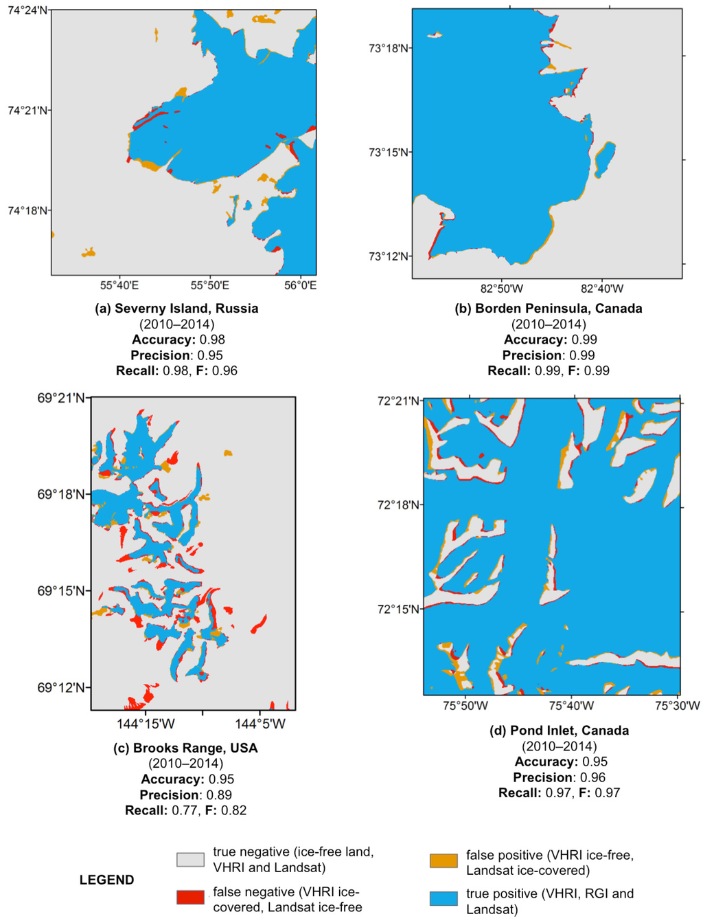 For the calculation of accuracy assessment metrics, we considered the RGI-derived or VHRI-derived glacier maps to be “truth” in the comparison with PISC maps computed using our approach. Using this assumption, we placed each pixel into one of four categories: (1) true positive (PISC mapped in both our approach and in the RGI or VHRI dataset); (2) false positive (PISC mapped in our approach, but ice-free land indicated by the RGI or VHRI dataset); (3) true negative (ice-free land mapped in both our approach and the RGI or VHRI dataset); and (4) false negative (ice free land mapped in our approach, but ice-cover mapped in the RGI or VHRI dataset). Based on these four categories, for each study area we calculated metrics commonly employed in assessment of binary snow and ice cover maps [