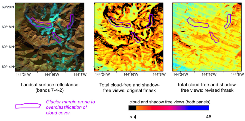 The revised cloud masking approach implemented here appears to be crucial to the success of the overall approach, as the data indicate that using the original CFmask would result in substantial regions with <5 cloud-free and shadow-free observations due to frequent false positives for cloud cover over certain types of terrain and land cover. Most notably, many of these regions of consistent cloud cover commission errors are located along the margins of glaciers, which would result in a disproportionately large effect on the accuracy of the final product. This effect is confirmed by comparison of accuracy between versions of our approach implemented using the original CFmask classification and the revised cloud masking approach.