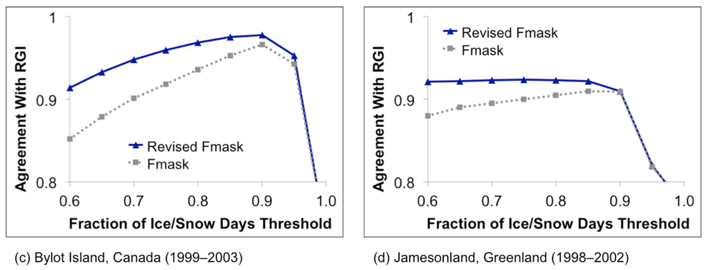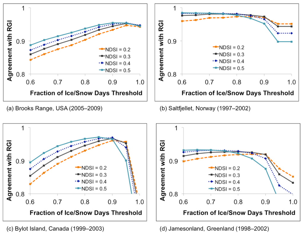 Our results suggest that a standardized approach where pixels with fDISC values >0.8 are classified as PISC should work well across much of the northern high latitude regions. However, the data also suggest that it may be possible to optimize the algorithm for specific regions by adjusting the fDISC threshold. The optimum value for this threshold will depend on a number of factors, including the prevalence of late lying seasonal snow patches in the region, the typical duration of seasonal snow cover, the prevalence of partially debris-covered ice on the lower portions of the glacier, and the number of cloud-free land surface views available.