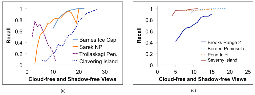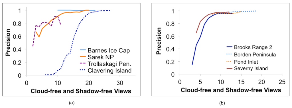 Although we might intuitively expect a PISC mapping approach would perform best by mapping PISC only at pixels where all cloud-free and shadow-free views contained snow or ice cover, our results suggest this is not the case. While the optimum fDISC threshold value varies by study region, the optimum threshold is <1.0 for all study areas, and for the Bylot Island and Jamesonland study areas, accuracy drops off substantially as fDISC approaches 1.0. There are two primary reasons why the optimum threshold is consistently <1.0. First, because we know that the cloud mapping approach will occasionally classify cloud-contaminated pixels as cloud-free, we expect that cloud-contaminated observations of snow or ice cover will typically have lower NDSI values than cloud-free snow or ice and will often be mapped as free of snow and ice. Using a strict approach (equivalent to an fDISC threshold value of 1.0) would ensure that PISC pixels with even one cloud-contaminated view would be mapped as ice-free. Second, areas of PISC with debris cover will generally have NDSI values that decline over the course of the summer as more debris is exposed. While areas of PISC with partial debris cover will likely always maintain a positive NDSI value (as opposed to the majority of other land surface types, which will indicate negative NDSI values when snow-free), the NDSI value may briefly drop below the NDSI threshold (in this case 0.4), resulting in an occasional surface view that would be classified as free of snow and ice. Again, in these situations, using the strict approach with an fDISC threshold value of 1.0 would classify these pixels as ice-free.