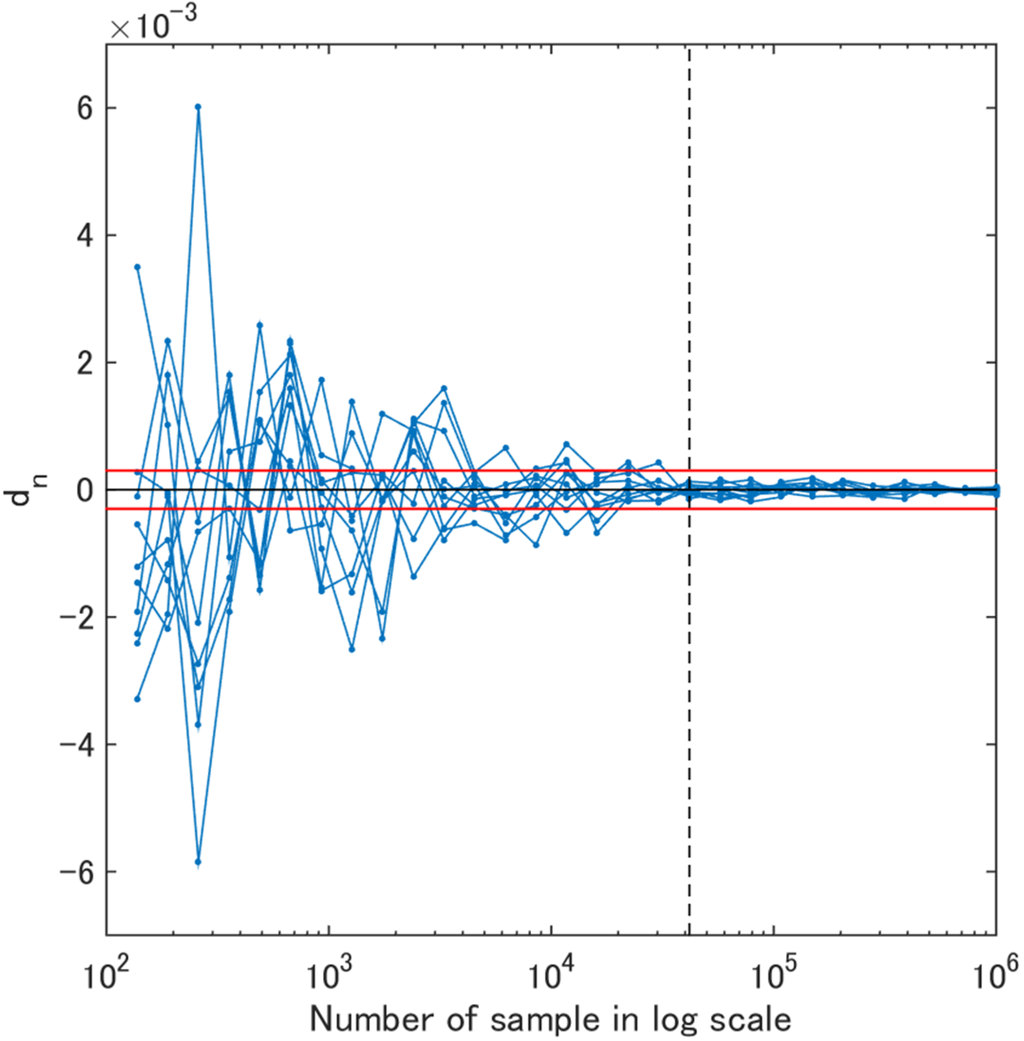 A random sample of the size of 102 reflectance pairs were selected from the extracted pairs in the above step, from which was computed. An additional number of randomly selected reflectance pairs were added to the first random sample to create a sample for from which first and then were computed. Likewise, were computed until = 29. This procedure was repeated 10 times to provide 10 sets of . To evaluate variability in , was plotted as a function of the sample size (Figure 1). changed by ±0.0003 when the sample size was equal to or greater than 41,754 highlighted by the vertical dashed line in Figure 1. This converges to zero when the number of samples is further increased. The threshold of 0.0003 was qualitatively determined after computing , but the change in MAD was small enough or nearly independent of the sample size when it was equal to or greater than 41,754. The minimum necessary number of samples in this study, therefore, was assumed to be equal to or greater than 41,754.