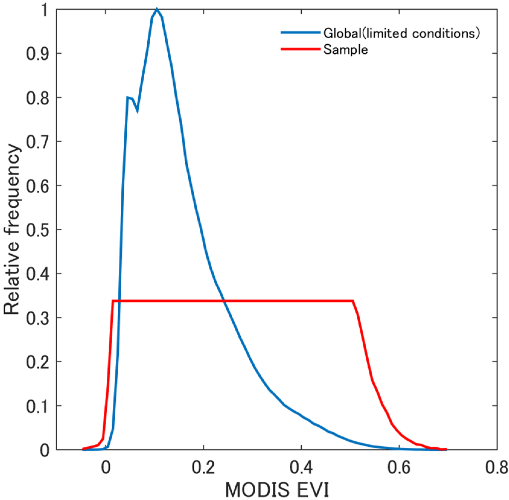 Relative frequency of MODIS EVI extracted from the climate modeling grid (CMG) data with the limited conditions regarding view zenith and azimuth angles and time period, denoted by blue line and that of data used for optimization (sample data), denoted by red line.
