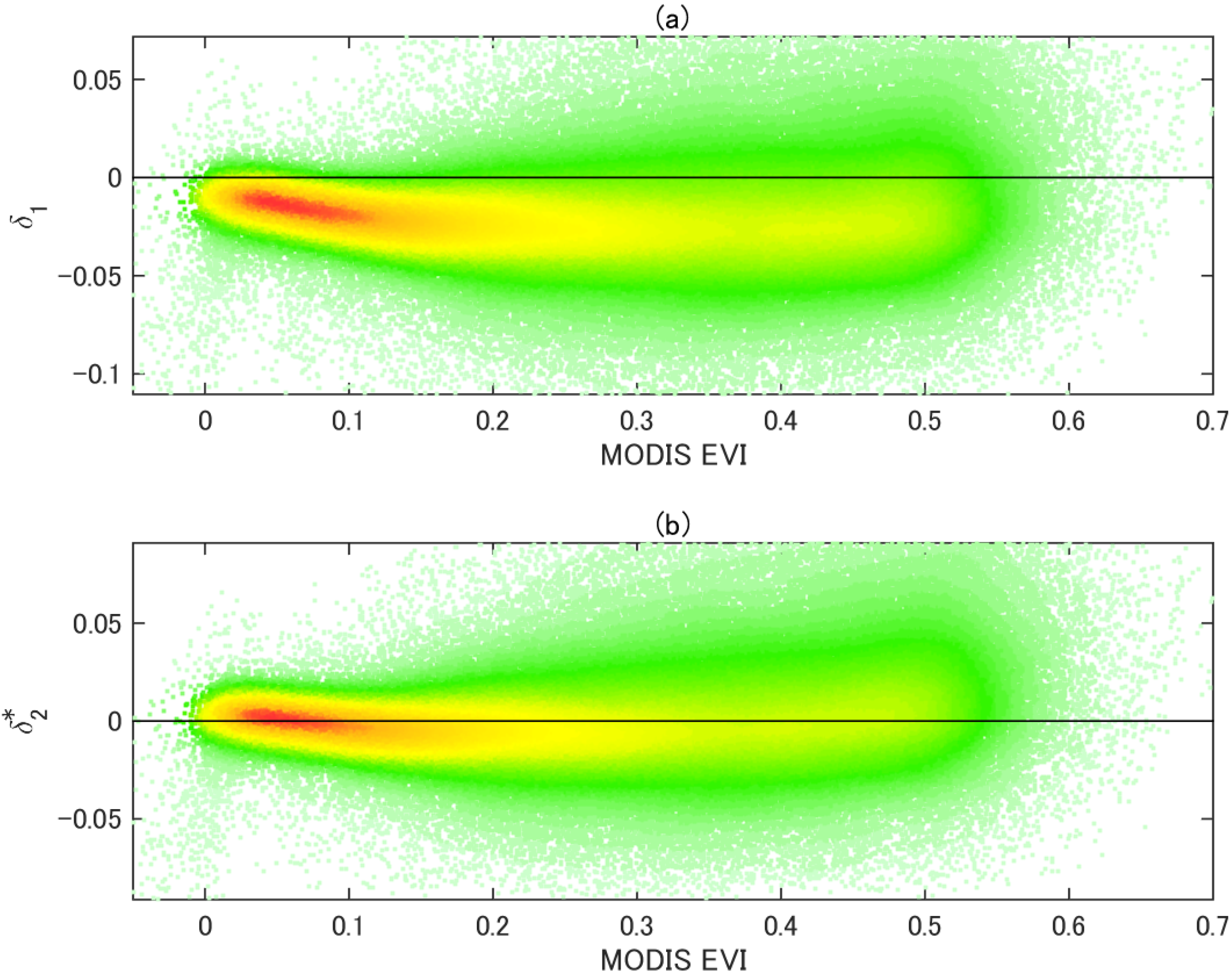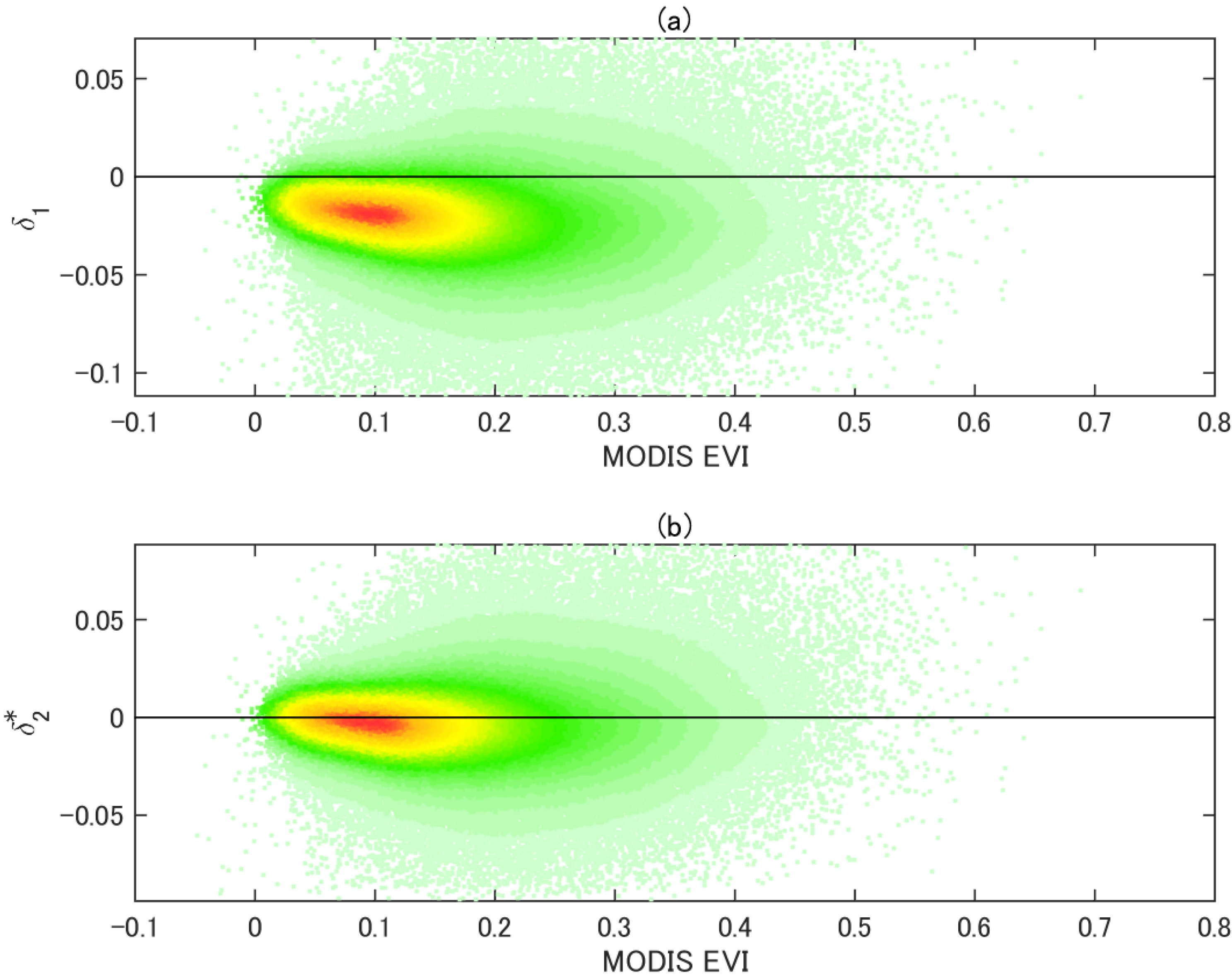 The derived equation of MODIS-compatible VIIRS EVI was a non-linear function of , and therefore the optimization of corresponds to the non-linear regression. The small non-linear biases, however, still remained in the (MODIS EVI minus MODIS-compatible VIIRS EVI) in Figure 3b. The comparison of our algorithm with alternative models such as polynomials is certainly important and worthy to evaluate, which is a focus of future work.