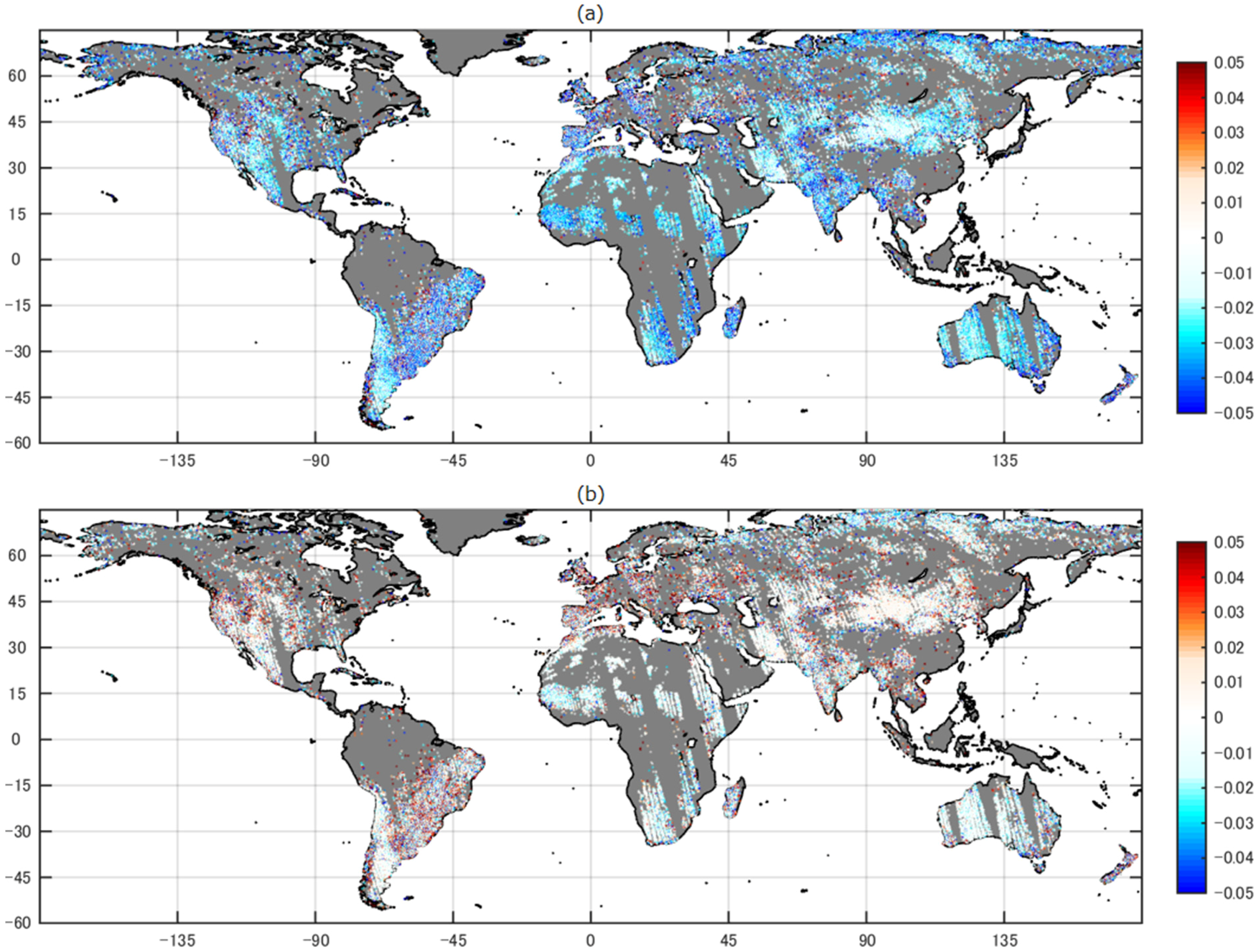 Figure 4a,b show the spatial distributions of and , respectively. In plotting and in map format, when multiple error values were found for a single grid, their average value is plotted for the grid. Errors were not measured over all of the grids because the MODIS and VIIRS sun-target-view geometry matchup were found over limited geographic areas. Note that the size of the colored dots is larger than the actual grid size (0.05°-by-0.05°) for improved visualization. Fewer samples seen in tropical forests and high northern latitude regions were due to frequent cloud cover and snow/ice cover. Generally, large negative values in were found everywhere, especially in the southeast area of the South American continent, India, West Europe, the western and southern part of Africa, and the northern part of the Eurasian continent. Positive errors were found in the regions that also showed large negative errors and where vegetation are found. Such samples might have been impacted by factors other than spectral bandpasses as mentioned before. Positive errors were also observed in the regions showing lower magnitudes of negative and positive values in (−0.03~0.01) such as sparsely/less vegetated areas and desert including Australia, northern Africa, the central part of Asia, and the southern part of South American continent.