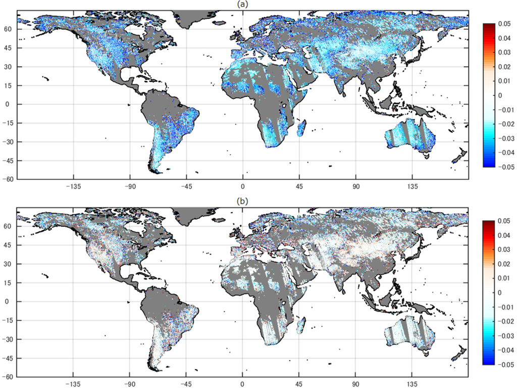 Figure 4b shows the spatial distribution of . The negative values in were corrected over the globe by the MODIS-compatible EVI. Areas that showed negative errors in Figure 4a resulted in smaller magnitude of errors. However, positive errors were not properly corrected and remained or increased in their magnitude, in particular, over the southeast of South America and Europe. Clusters of negative errors (approximately −0.01) were observed in Africa, Australia, east South America, and the northern Eurasian continent (the areas heavily impacted by either persistent cloud cover or winter snow cover).
