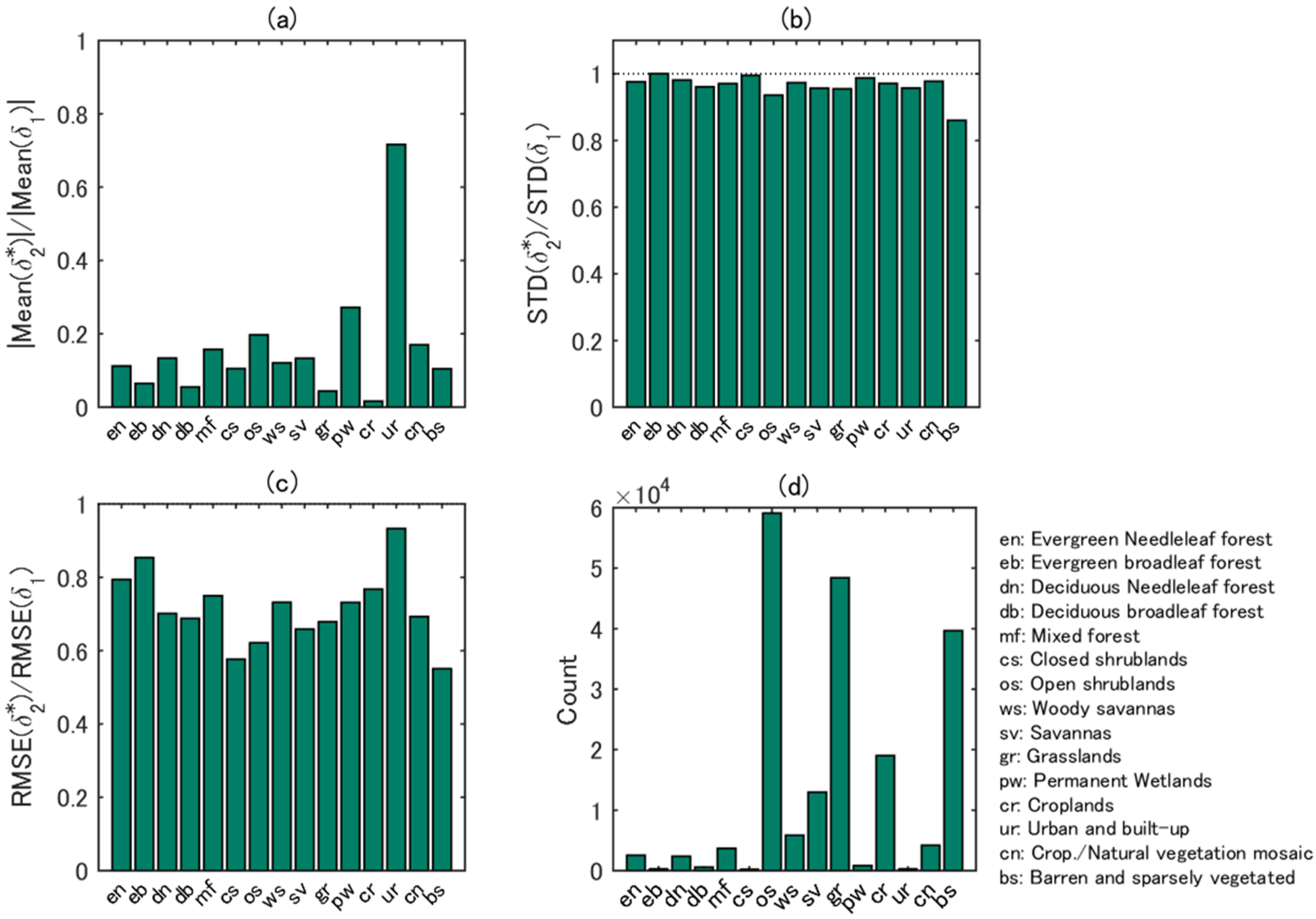 (a) Ratio of absolute mean of difference between MODIS EVI minus MODIS-compatible VIIRS EVI () to that between MODIS EVI minus VIIRS EVI () for land cover-dependent data; (b) Ratio of STD for to that for ; (c) Ratio of RMSE for to that for ; (d) Frequency of land cover type distribution in data for evaluation.