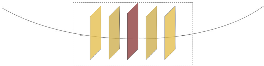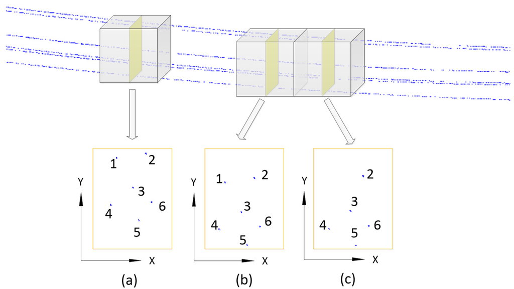 The distribution of power-line group set between two neighbor pylons are similar: roughly parallel, with the same sag and direction. A profile segmentation based method is used to detect these similar properties. Figure 1 outlines the method of segmentation. Firstly, the power-line point data between two neighbor pylons are segmented into profiles (indicated with transparent cuboids) equally distant along the main direction of the power-lines. Then, the points within a profile are projected to its main plane (indicated with a yellow plane). A region growing algorithm is used to connect the comparable projecting points and create groups (indicated in Figure 1, a number represents a center point of group). This segmentation method are also used for constructing neighborhood space of points. There are three levels for neighborhood space construction: point-based level [31], voxel-based level [32,33] and object-level [34]. The points within a group of a profile are considered to be within a neighborhood which containing local structure of a singular power-line. In order to maintain consistency of the coordinates among the different profiles, the coordinates for a projection plane are constructed by the following rules: (1) the X and Y axes are orthogonal to the main direction of the power-lines; and (2) the point of origin is a certain point projecting to this projection plane. As shown in Figure 1, projected center points on neighboring profiles have a similar distribution.
