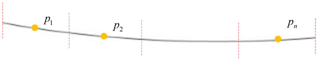 Due to the projection way, the locations of center points of each power-line on adjacent profiles are similar (see Figure 1b,c). Thus, we first use distance to test for points on a specific power-line span between two neighbor projecting profiles. The distance is defined as , where and are the coordinates of points and on profiles and , respectively.