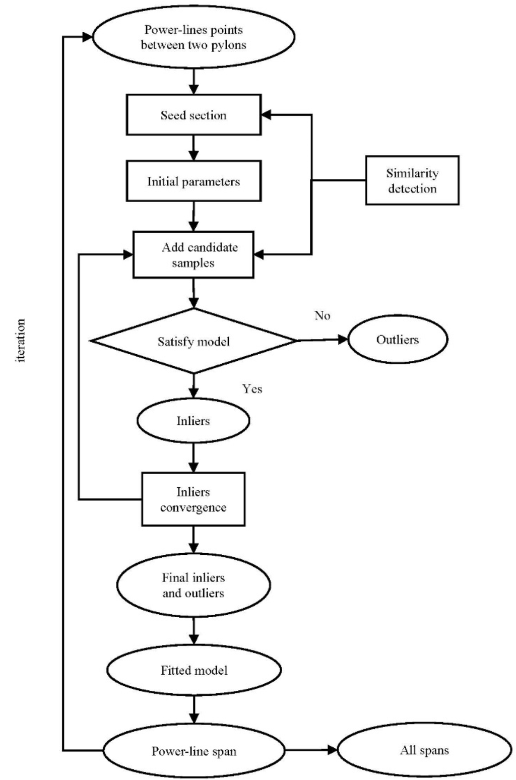 Due to these two favorable properties, the RANSAC method can improve reconstruction results. Figure 5 describes the flow chart of RANSAC for power-line span reconstruction between two connected neighboring pylons. At the beginning, we select a seed section with similarity detection. The other candidate samples are gradually added into the model to determine whether they are inliers or outliers. After incorporating all of the inlier points, the parameters of the power-line span are recalculated. These steps run iteratively until the parameters converge. The power-line span model is then chosen as the final result if their length is bigger than a defined threshold. After all spans between two connected neighboring pylons are iteratively reconstructed using the rules described above, the final output is all well-reconstructed spans between these two neighbor pylons.