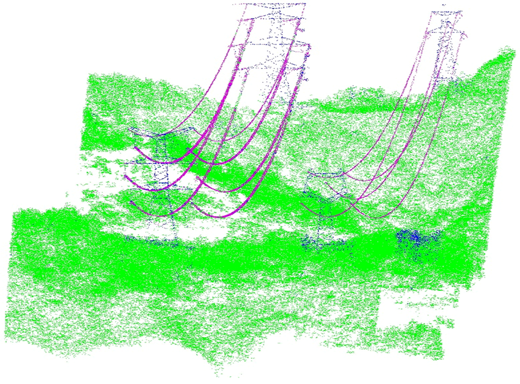 The classes of major points are correctly identified using the classification algorithm [21]. However, there are many misclassifications. Some points representing power-lines adjacent to the region of pylons are misclassified as vegetation or pylon. Some points representing vegetation are misclassified as power-lines because of the sparse distribution. Misclassified points are also detected in pylons where they are labeled as power-lines. The main reason is that the structure of a pylon is comprised of multiple metallic triangles for stabilization, and the sides of the triangles share the same linear structure characteristics as power-lines. There are also many false vegetation points that belong to pylons. This is because the densities of pylon points vary in different regions, especially the intersecting regions between power-lines and pylons and regions near the ground.
