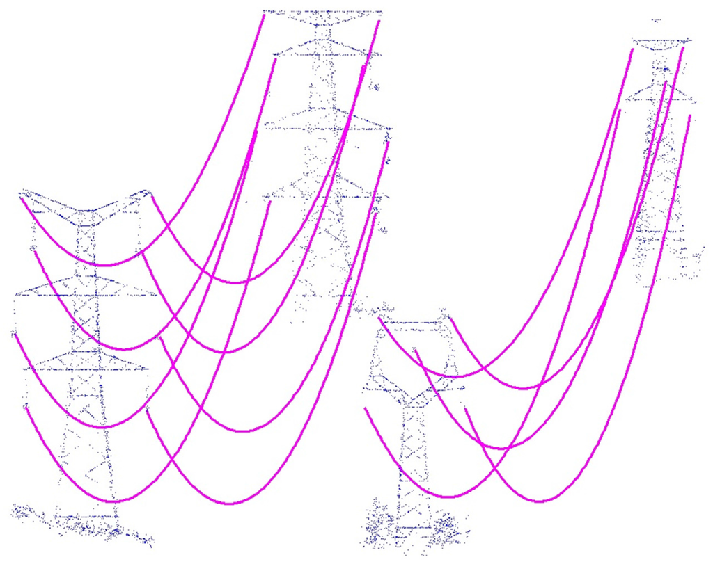 There have been many methods for power-line span reconstruction, which mainly focus on constructing a singular line span. McLaughlin defined the parametric model of a power-line span, and extracted each individual span from classified power-line point cloud data [12]. Firstly, the model is fitted locally to a small seed region, which is then grown by adding neighbor points consistent with the trend of the model. After a region has been grown, the parameters of its corresponding model are re-estimated. This process is iterated until a given termination criteria is met. Jwa et al., introduced a method for detecting and modeling power-line spans based on perceptual grouping framework which groups similar features at different levels of information using a Voxel-based Piece-wise Line Detector (VPLD) method for power-line modeling [13]. Melzer and Briese firstly use a 2D Hough transformation to locate the groups of parallel power-lines in the projection points onto the XY plane. A 3D fit for each power-line span is then computed locally within its corresponding corridor [14]. Liang et al. considered that points in the same power-line would be close together whereas the points in different power-lines would be far apart [15]. Therefore, a power-line points clustering method based on KD trees was adopted. This method only considered the point distance and it ignored breakage points, which may have detrimental effects. Jwa and Sohn proposed a piecewise catenary curve model-growing algorithm to identify the points, which achieved clustering by iterative catenary curve fitting and cubic growing [16]. To a certain degree, this method is limited with the fitting curve and the selection of the initial growing cube. Based on the piecewise model growing [16], Sohn et al., precisely modeled power-line spans with catenary curve models in 3D, once the pylon localization is accomplished [17]. Cheng et al. introduced a method based on vehicle-borne LiDAR to cluster of power-line points, in which the initial clustering and clustering recovery procedures were conducted iteratively to identify each power line [18]. Also the sag reconstruction results are mainly based on robustness of the methods, it is also influenced to ambient conditions such as the temperature and the ageing of spans [19]. Lu and Kieloch [20] surveyed the modeling accuracy of power lines based on conductor temperature. They found that wind, electrical load and solar radiation are the three major factors that may affect the modeling accuracy. Because the data used in this paper were mainly collected in one time, we mainly focused on the reconstruction on certain ambient conditions when the point cloud data were obtained.