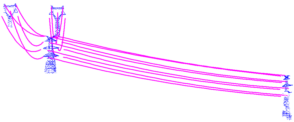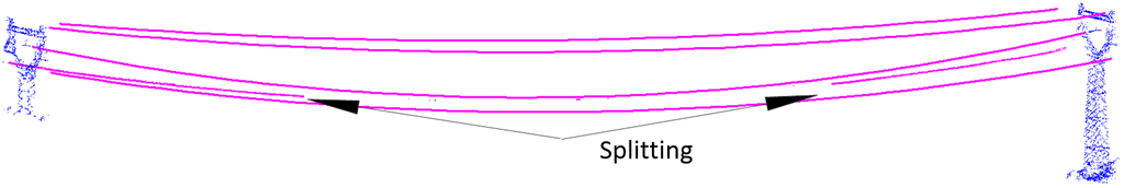 One typical situation is the splitting: a group of power-line spans are split to be two or more groups. In this situation, power-lines are connected asymmetrically between different types of pylons. Irregular power-line span shapes increase the difficulty of the reconstruction. Using our method, based on the local shape properties of a single power-line span and the distribution properties of power-line group between two neighbor pylons, power-line spans can be successfully reconstructed (Figure 8).