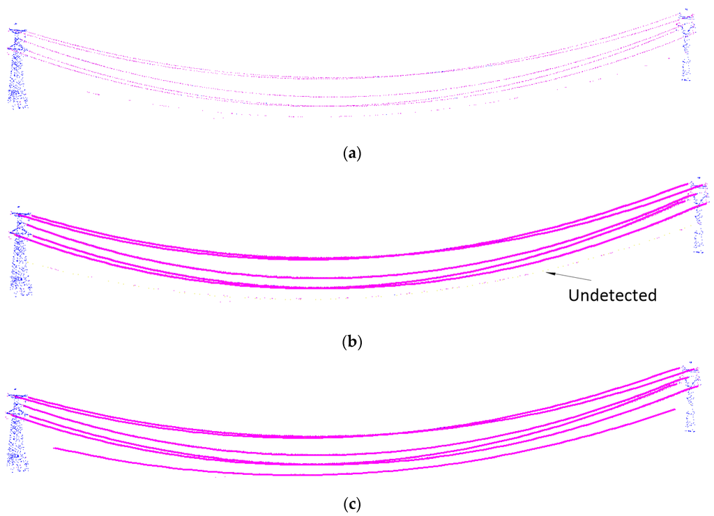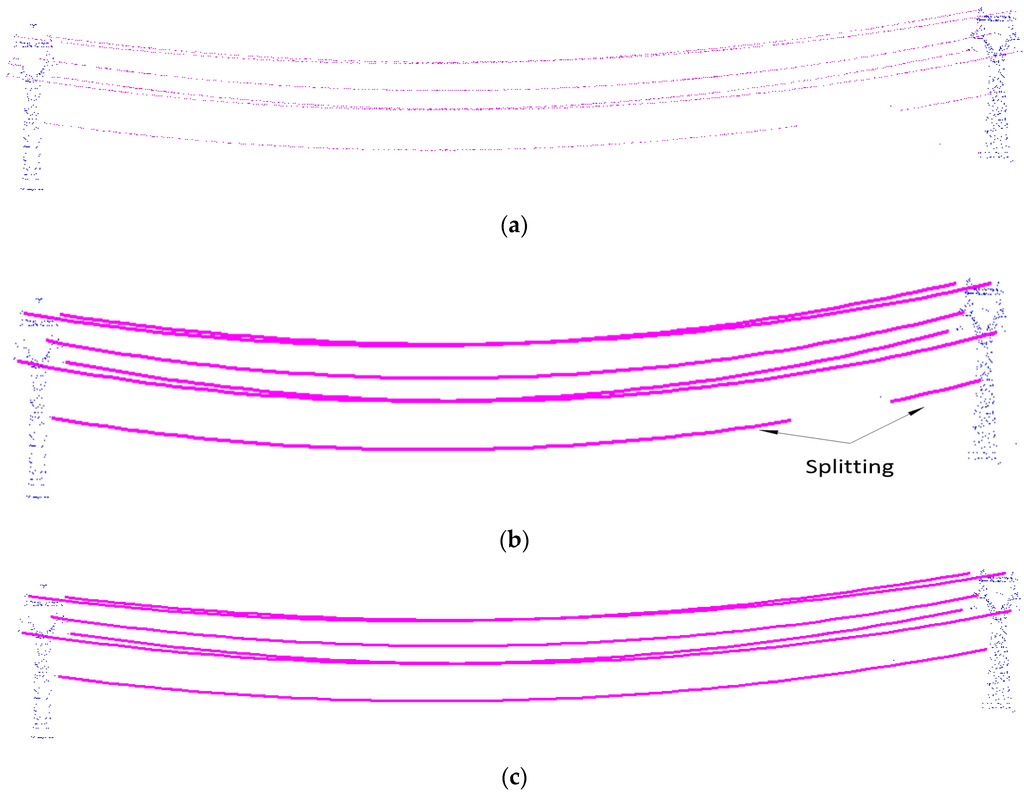A number of power-line spans are also undetected using the method of McLaughlin [12] (Figure 12b). This is primarily due to the sparseness of the data, resulting in a failure to fit initial parameters of a local model or a failure of the iterative grouping algorithm to aggregate the sparse points into a single span. Using the methods introduced in this paper, based on the properly-fitted parameters and effective candidate samples searching, this problem can be overcome and produce good results (Figure 12c). In Figure 12c, a span with sparse points is successfully reconstructed except for a small part undetected where there are almost no data points.