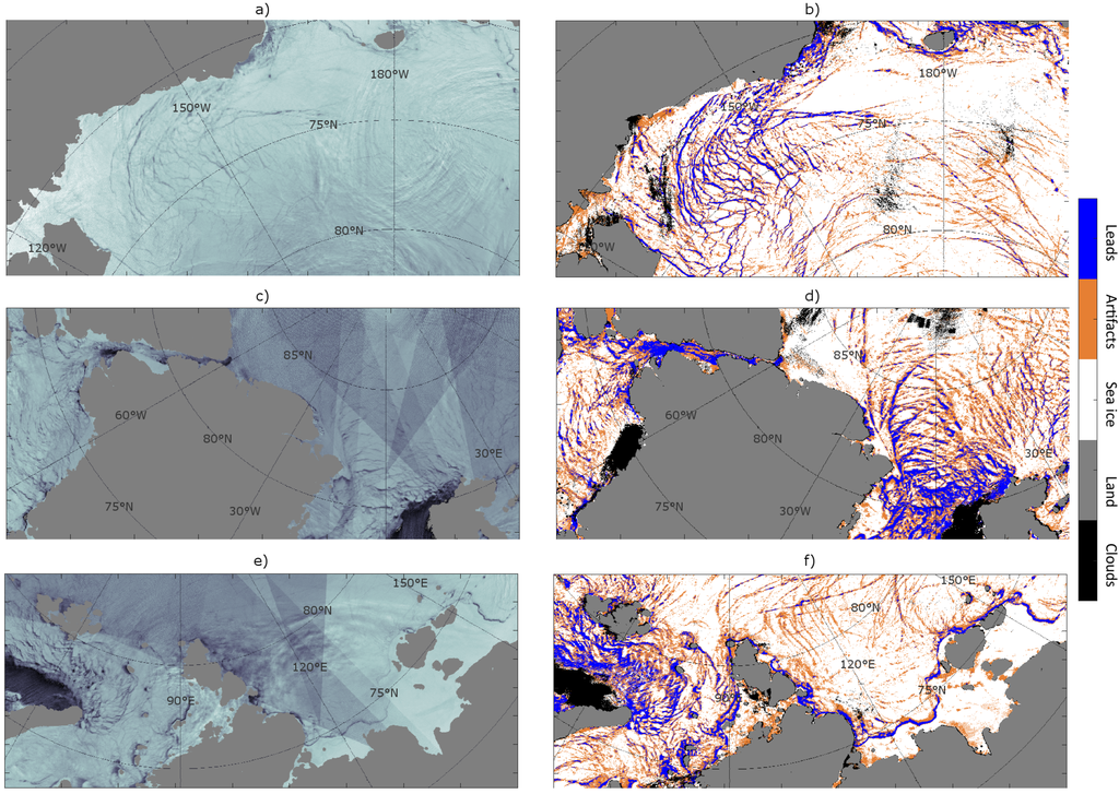Almost the entire the Arctic Ocean is covered by sea ice during wintertime and spring. One of the key features of the ice cover is the presence of leads: recurring and elongated areas of open water and thin ice. The World Meteorological Organization (WMO) defines a lead as a more than 50 m wide crack in the ice from several kilometers to hundreds of kilometers in length. Leads promote a very strong exchange of heat and moisture between the relatively warm ocean and the cold winter atmosphere (e.g., [1,2]). Consequently, a considerable fraction of new ice is produced in leads, thereby contributing to the seasonal sea-ice mass balance of the whole Arctic. Leads have moreover been recognized as a source of global methane emissions, which makes them a potential driver for greenhouse gases [3]. The recurrence of leads and their spatial distribution are valuable diagnostic parameters for the sea-ice drift [4] and changes in the sea-ice stability [5] and represent an essential habitat for marine mammals and birds [6]. Hence, especially in light of the observed trends in Arctic sea-ice extent ([7,8,9]), and with respect to the projected future changes in the Arctic climate system, the structure and dynamics of leads represent essential information for global change monitoring, e.g., [10]. The spatial resolution of sea-ice models is generally too coarse to simulate leads explicitly. Therefore, the sub-grid lead fraction in global and regional sea-ice/ocean models is mainly parameterized [11]. As leads have a strong impact on the atmospheric boundary layer (e.g., [12,13]) and via atmospheric forcing and sea ice production also on ocean processes [14], verification data sets for lead parametrization are needed.