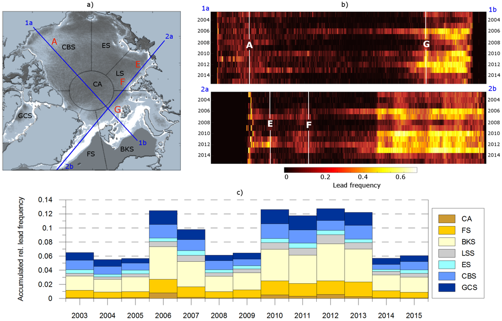 From the daily FCAF filtered lead maps, we derive the inter-annual variability of pan-Arctic lead dynamics by calculating the accumulated per-region lead frequency (Figure 6c). One can see that especially the years of 2006, 2007 and 2010 to 2013 exhibit a positive anomaly in the pan-Arctic lead activity, which is caused by high lead frequencies in almost all of the presented sub-regions. As far as regional differences are concerned, the largest number of leads occurs in the Fram Strait (FS) and Barents/Kara Sea (BKS) regions, where the marginal ice zone is located, while the central Arctic (CA) is characterized by low lead frequencies throughout the entire investigation period with some exceptions in 2006, 2010 and 2012.