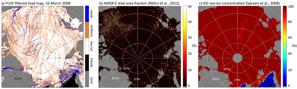 In the sense of our retrieval approach, a lead is represented by a significant positive temperature anomaly compared to its surrounding. As such, a narrow region of open water can cause the same temperature signal within a MODIS pixel as a broader region covered with thin ice. However, the significance of the bulk temperature anomaly can be expected to promote the ocean-atmosphere fluxes of sensible and latent heat (e.g., [40,41]) within a pixel where a lead is recognized in the presented product. This feature makes the quasi-daily lead maps a valuable source for a verification of ice-ocean models, heat-flux parametrization and an indicator for sea-ice divergence. Marcq and Weiss [13] argue that lead widths are power law distributed, and they furthermore state that small leads with a width of several meters are more than twice as efficient at transmitting turbulent heat as those with an extent in the range of several hundreds of meters. Since the very narrow leads cannot be resolved with the lead maps introduced here, more research is necessary to link different spatial scales and thereby provide a consistent view of lead dynamics in the entire range of their width distribution. The presented lead maps nevertheless yield a valuable data set to support sub-grid scale parametrization of the spatial distribution of heat fluxes in ocean/sea ice models. As clouds and artifacts cause data gaps in the daily maps, there could be potential to combine the data set presented here with passive microwave lead retrievals as introduced by Röhrs et al. [26] (Figure 7a,b). A preliminary comparison between daily maps of their lead area fraction and the binary lead maps presented here revealed similarity in the most prominent lead structures and polynyas, while at the finer spatial scales, substantial differences in regional lead occurrences are exhibited that need to be addressed before a merging of these data sets could become applicable (Figure 7b). In comparison to widely used sea-ice concentration data (e.g., Spreen et al. [42], Figure 7c), the daily lead maps presented here reveal additional details about small-scale structures within the ice, as they are also found where passive-microwave data indicate nearly 100% ice cover.