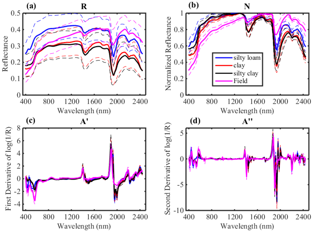 - Time-series of surface hyperspectral reflectance data were measured while measuring the weight for these containers. Measurements continued until the container weights became constant. In total, there were nine measurements for the silty loam, ten measurements for clay and twelve measurements for silty clay.