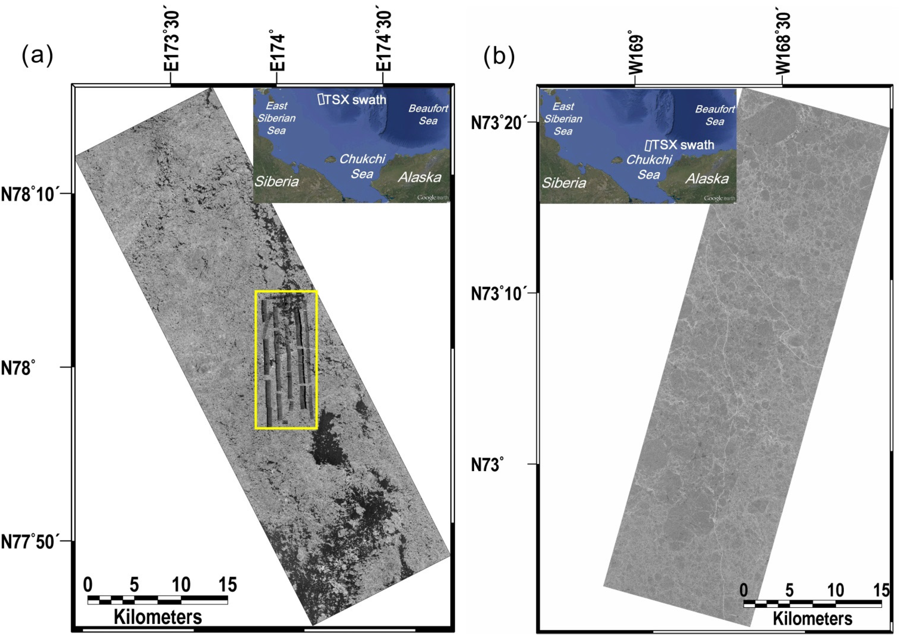 TerraSAR-X (TSX) amplitude images (HH-polarization) obtained in the Chukchi Sea on (a) 12 August 2011 and (b) 21 July 2010, respectively. The airborne SAR images are overlaid on the 2011 TerraSAR-X amplitude image (yellow box). The TerraSAR-X imaging area corresponds to the white solid box in each map.