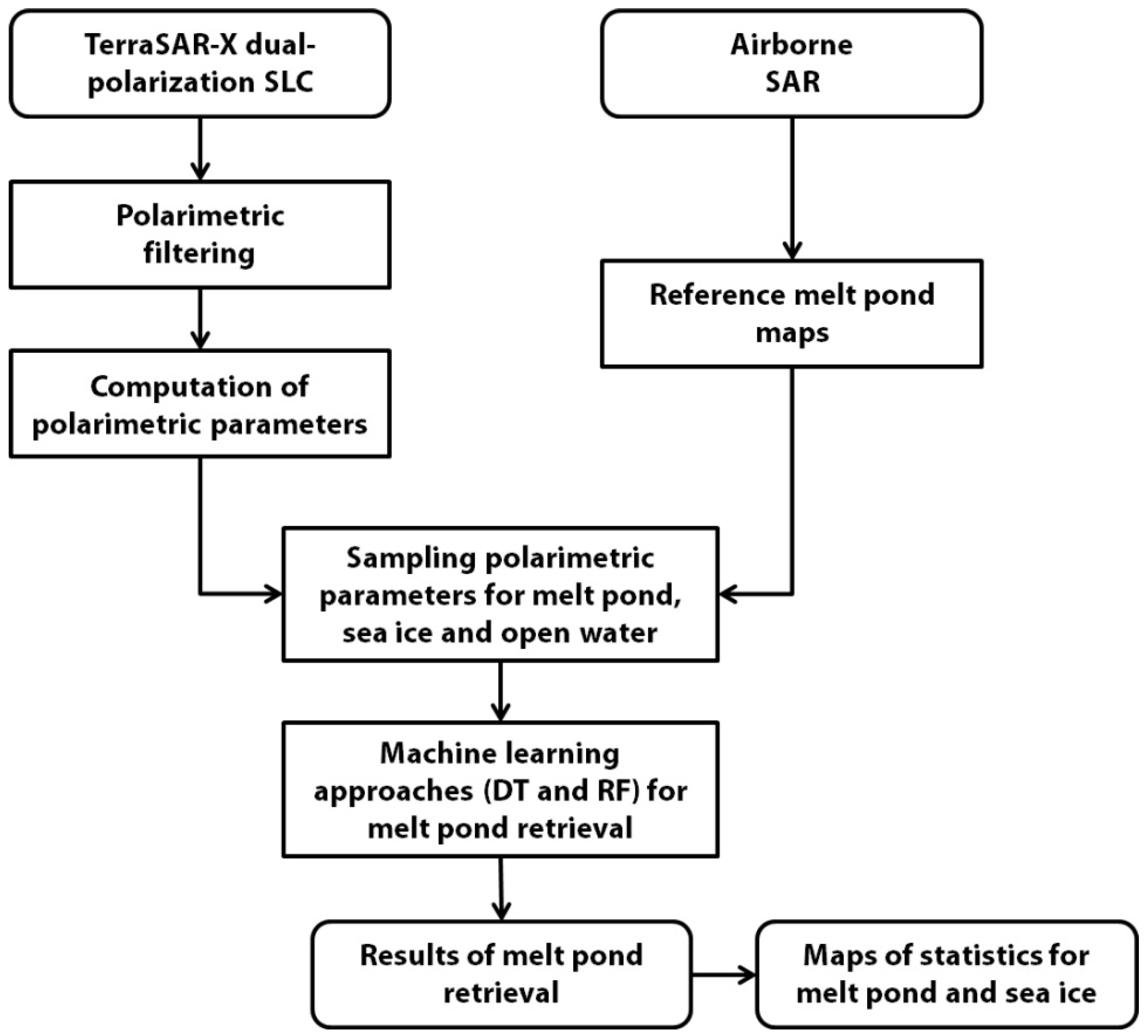 In this study, machine learning-based classification approaches were used to retrieve melt ponds on multiyear ice, in which the backscattering and polarimetric parameters of the TerraSAR-X dual-polarization data were used as input variables. Figure 2 shows the processing flow of the classification approach. This section presents the construction method of the reference dataset from the airborne SAR images, the computation of different polarimetric parameters and two rule-based machine learning approaches used for the classification of open water, sea ice and melt pond. The computation of various statistics for melt ponds is also described in this section.